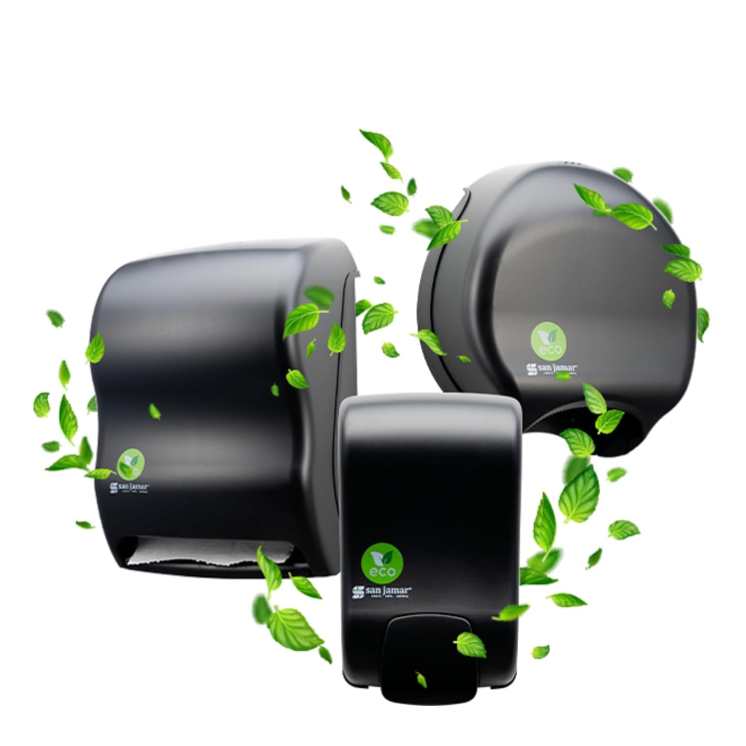 These San Jamar dispensers, made from over 60% recycled ABS resin, promote sustainability and reduce waste, contributing to a greener environment