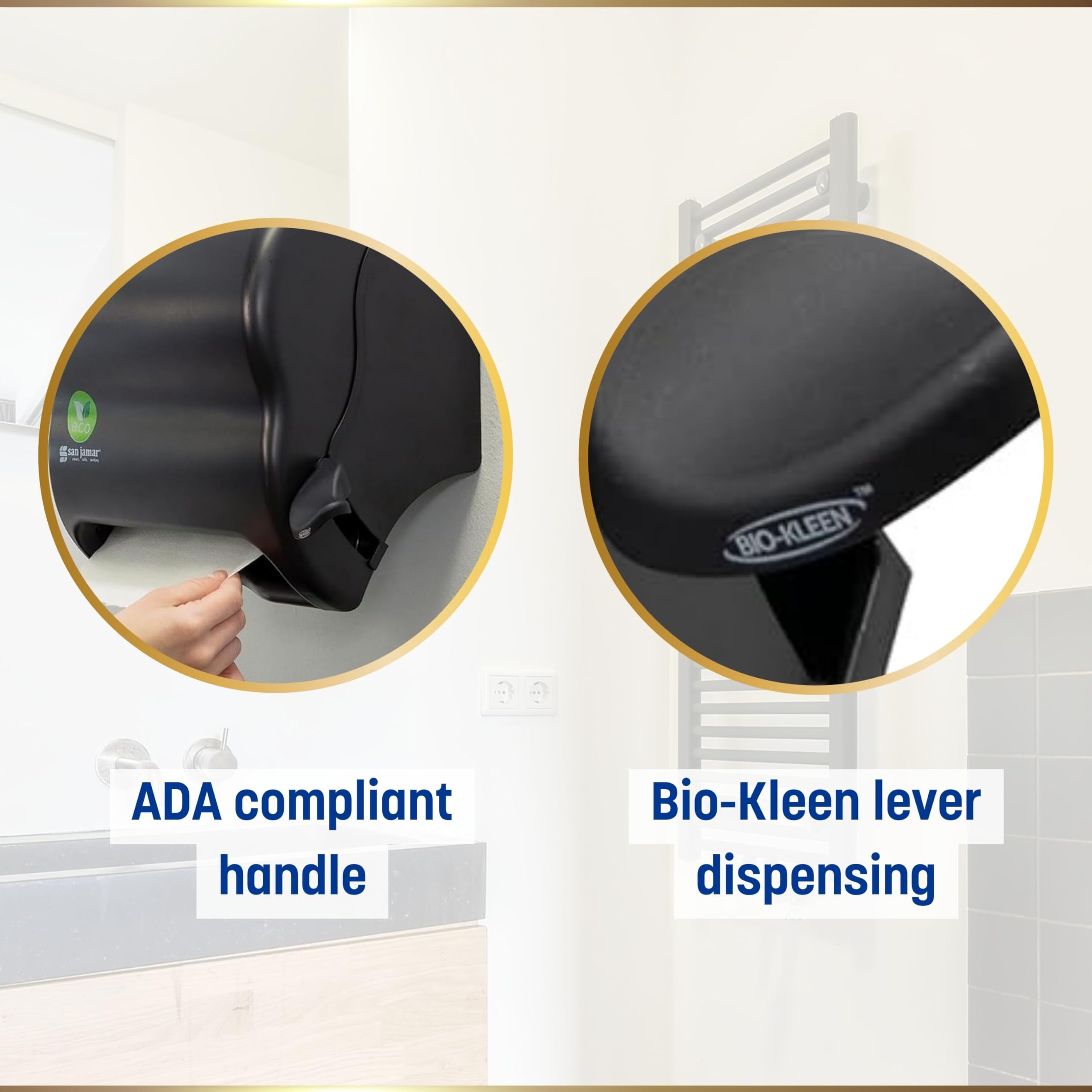 The San Jamar Ecologic Element Paper Towel Dispenser is a sustainable and efficient solution for bathrooms, kitchens, and restaurants. Crafted from over 60% recycled ABS resin, these dispensers promote sustainability and reduce waste, contributing to a greener environment. All packaging and assets, including literature, bags, and corrugate, are crafted from recycled materials, aligning with our zero waste commitment. Accommodate all roll paper qualities with ANY core size, including coreless, solid, and centerpull options, offering versatility and reducing the need for multiple dispenser types. With a 33% smaller footprint than standard roll towel dispensers, this dispenser is ideal for tight spaces, maximizing efficiency without sacrificing capacity or functionality. Store a standard 800’ 8” roll towel, significantly reducing the frequency of refills and ensuring continuous availability of paper towels. Crafted from recycled plastic, this black dispenser is designed for durability and sustainability while offering convenient manual dispensing with a lever. Whether in a compact restroom or a bustling kitchen, this dispenser is a practical and eco-friendly choice for efficient paper towel management (Model Number: T950REBK).