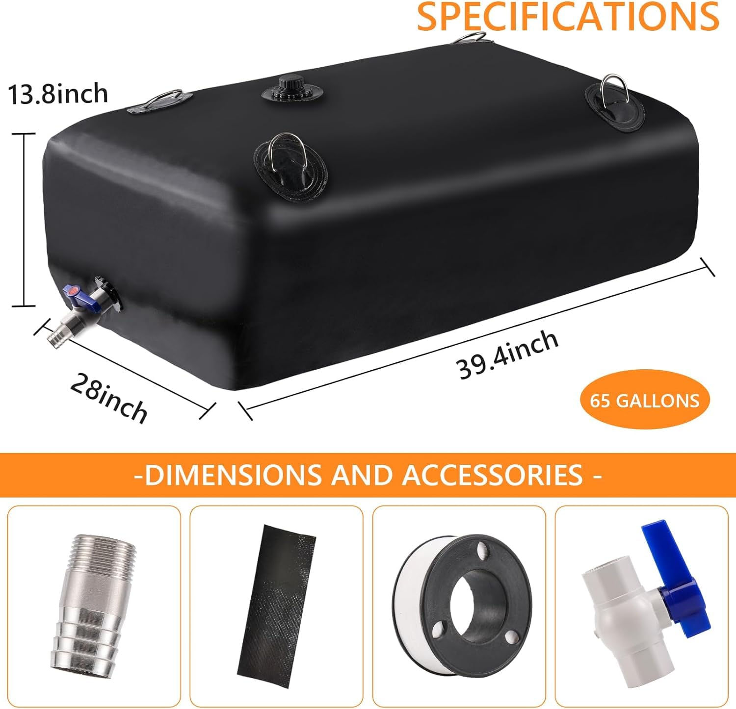 POTABLE WATER STORAGE BLADDER: A portable water tank quickly fills with water using the bladder's 1.5-inch wide opening. Outlet valve 3/4 spout, stainless steel material is strong and durable. Portable water storage has a convenient outlet valve on/off switch for easy access to water and provides you with emergency water storage.