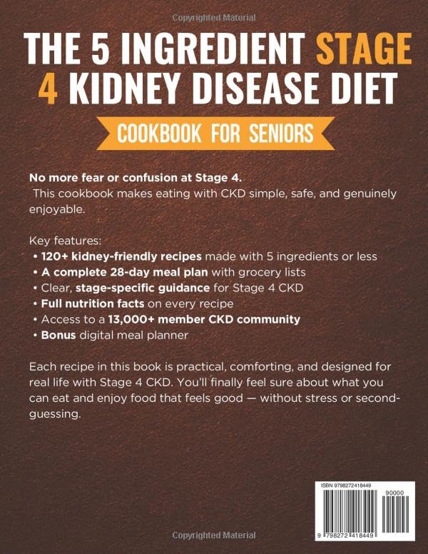 You’ve reached Stage 4 Kidney Disease… and suddenly, every meal feels like a puzzle you’re afraid to get wrong. As someone who leads a community of over 14,000 people living with CKD, I know how overwhelming this stage can feel — with the constant confusion, stress about the wrong ingredients, and boredom from eating the same foods again and again. That’s why I created this cookbook: realistic, diversified, and kidney-safe meals with just 5 ingredients or less. ★ Why People with Stage 4 CKD Choose This Book ✓ Tailored for Stage 4 CKD – Practical, stage-specific guidance that finally clears up what’s safe to eat and what to avoid — without the endless contradictions. ✓ 120+ real-food recipes – All kidney-friendly and made with 5 easy-to-find ingredients or less. Comforting meals that taste like real food, not restrictions. ✓ Only 5 Ingredients – Short ingredient lists, quick prep, and simple steps you can follow even on low-energy days. ✓ Done-for-you 28-Day Plan – A full month of ready-to-use menus and grocery lists, so you don’t have to calculate or plan anything yourself. ✓ Backed by real experience – Built from the shared lessons, successes, and struggles of 13,000+ CKD members — not theory, real life. ✓ Clarity, not confusion – Honest, easy-to-understand explanations to the most common Stage 4 CKD questions your doctor didn’t have time to cover. ✓ Complete nutrition info – Every recipe includes calories, protein, sodium, potassium, and phosphorus, so you always know exactly what’s on your plate. ✓ Doctor Approved – Reviewed by Dr. Maria Vargas Martinez, MD, Family Medicine, who works with patients managing chronic conditions such as CKD, diabetes, and hypertension. ★ Your Bonuses Inside ✓ Exclusive CKD Support Community – Join 14,000+ people who share recipes, wins, and real advice for everyday kidney living. ✓ Digital Meal Planner – Plan your week in minutes; it auto-builds your shopping list and calculates macros for you. ★ Why This Book Works When Others Don’t No fancy ingredients. No complicated recipes. No fear every time you sit down to eat. This cookbook is for real people living with Stage 4 CKD — designed to make eating safe, simple, and genuinely enjoyable again. Every recipe uses ingredients you already have (or can easily find), with clear steps and soft, comforting textures that make mealtime stress-free. Because you deserve meals that feel good, taste good, and support your kidneys. 👉 Scroll up and click “Add to Cart” to start cooking with confidence.