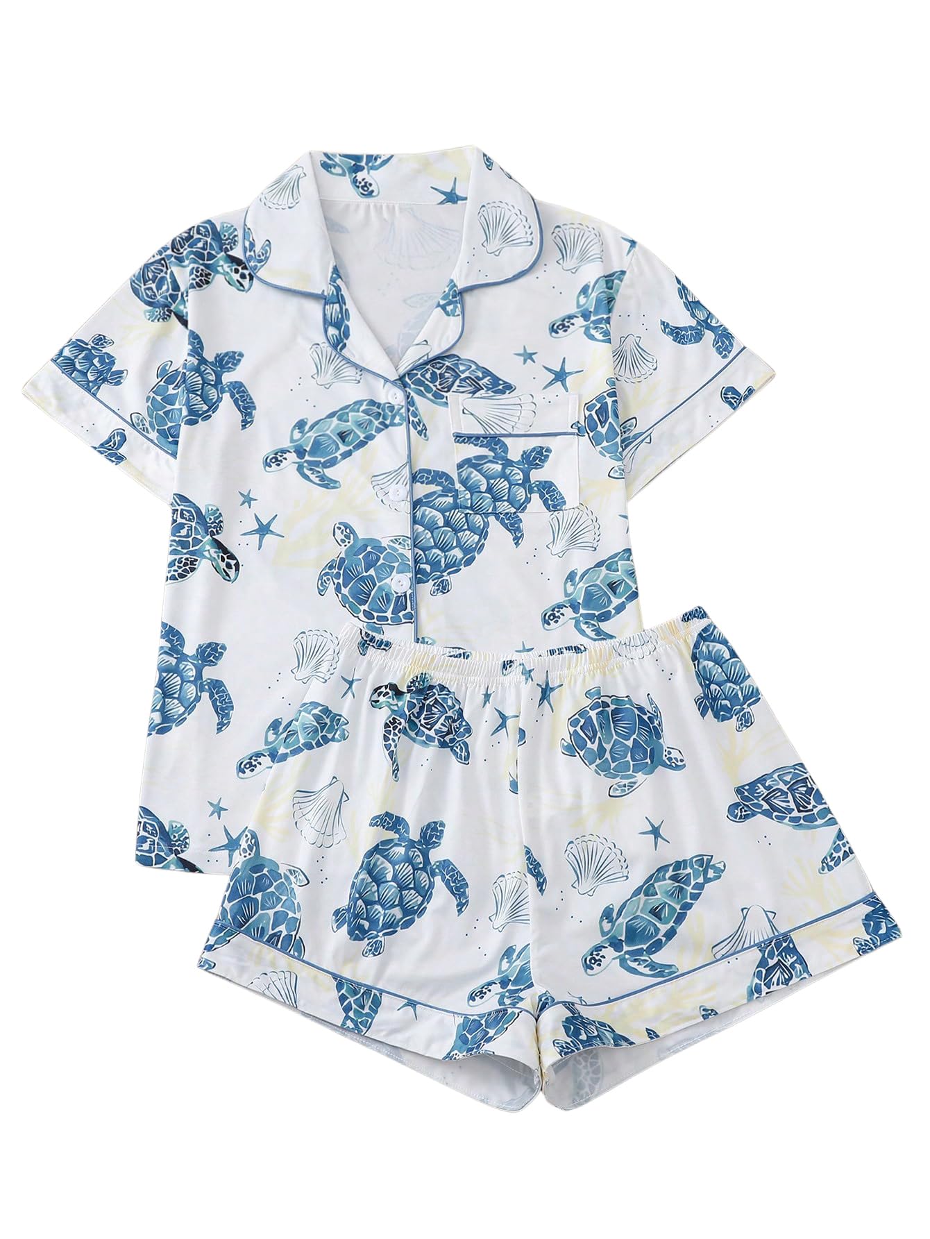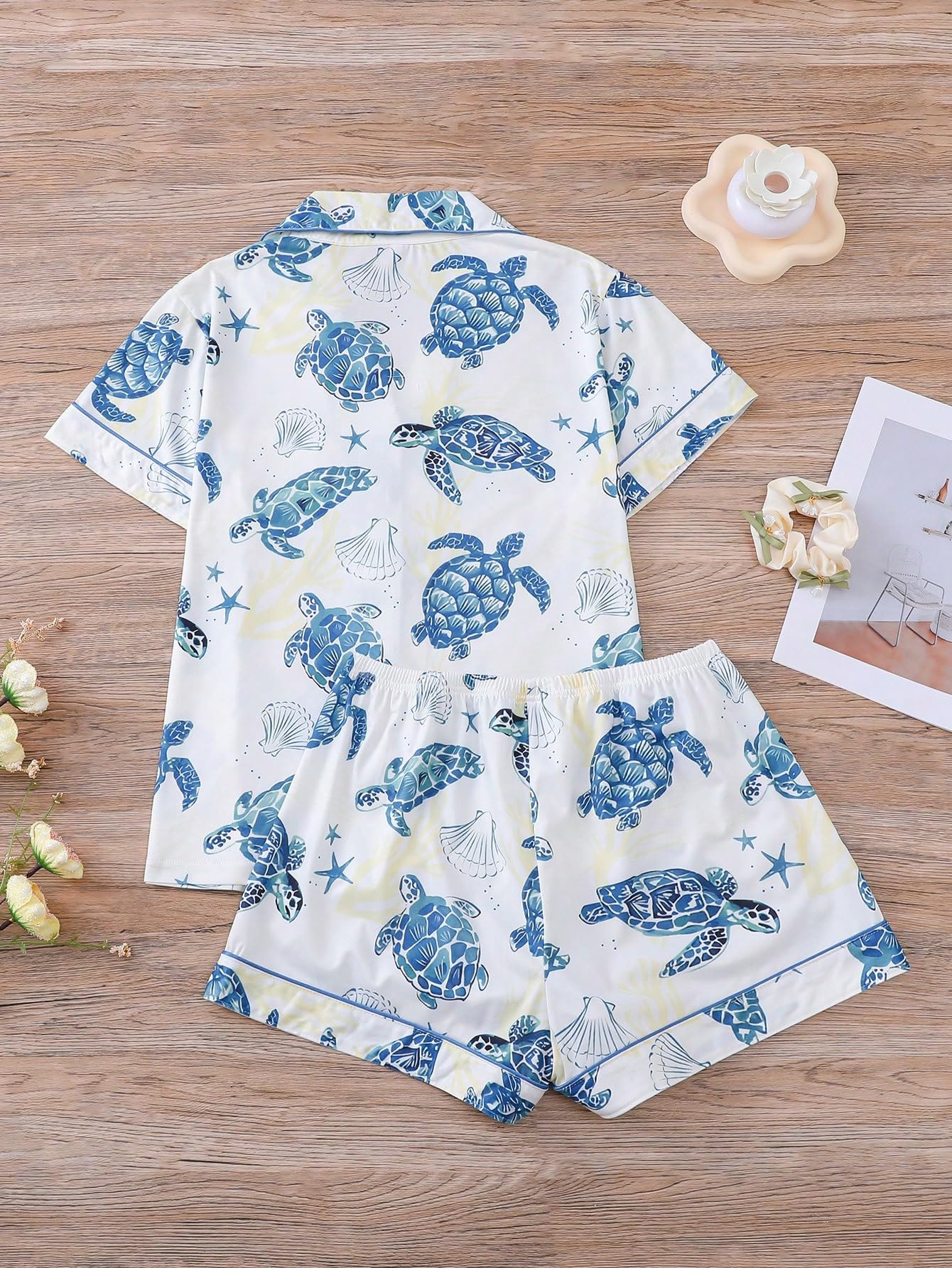 Lapel Collar, Short Sleeve, Print Pajamas, Bow Decoration, Button Down Top and Shorts, Loungewear Sets, Women's Sleepwear.