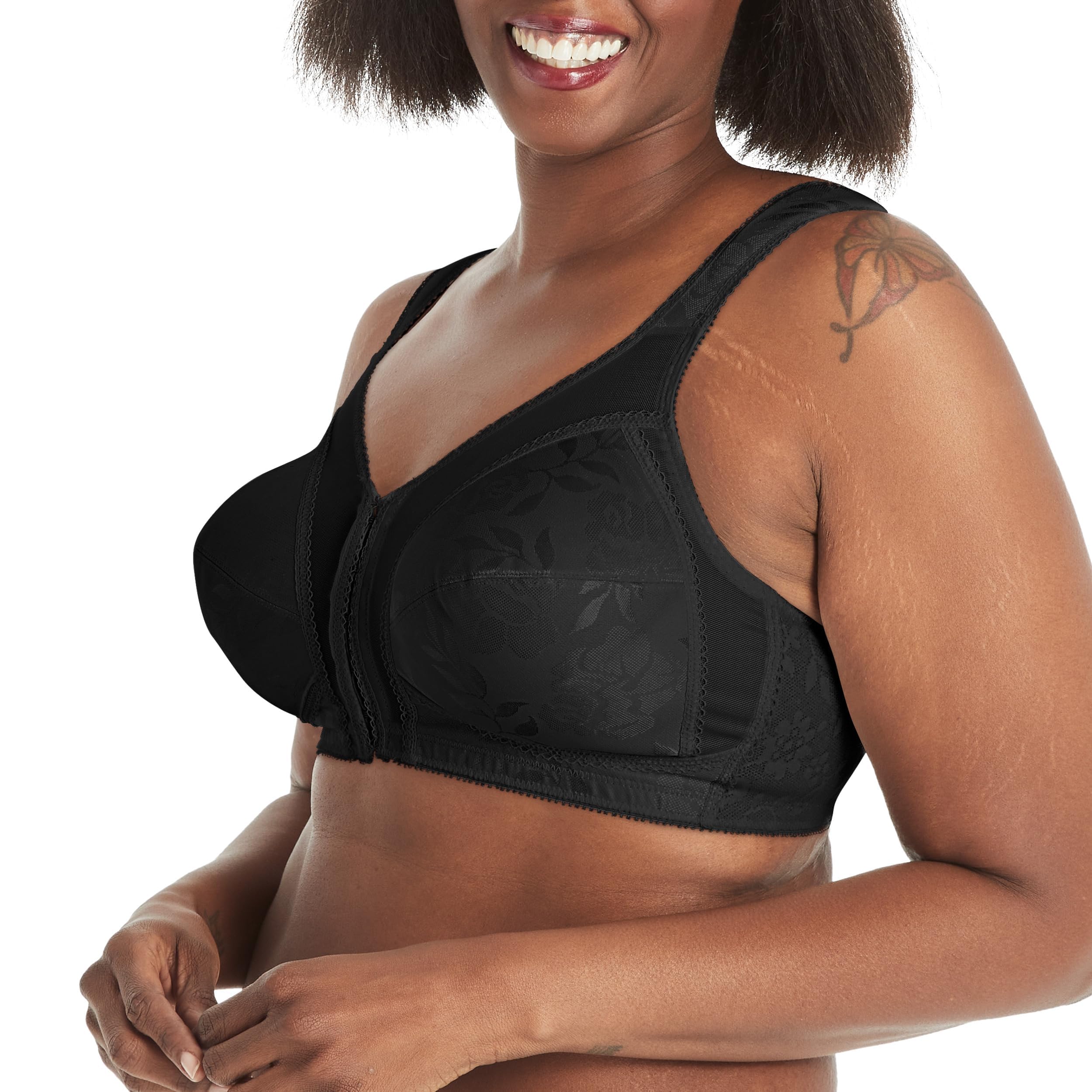 Description Here's a wireless bra for fuller figures that provides the support you need and the comfort you deserve. This wireless bra from Playtexยฎ is part of the famous 18 Hourยฎ collection, a go-to favorite for so many customers who value wirefree comfort but need superb support. With a convenient, easy-to-hook front close, getting dressed in the morning is effortless and faster with this wireless bra in your drawer. Brilliantly and thoughtfully designed, this everyday bra is made with the Playtexยฎ 4-way TruSUPPORTยฎ system that provides higher sides for bulge control, fuller, softly seamed cups for natural shaping, wider straps for all-day ease, and a smoother back for enhanced stability. In addition, this wireless bra has the Playtex Flex Back - two wide crisscross stretch bands that stretch and support for ease of movement. The straps play an important role in the comfort of this full-coverage bra, with their wider, cushioned design that helps relieve shoulder pressure for no-dig comfort. Plus, this wireless bra is fashioned around the famous Playtex M-frame that comfortably conforms to your shape. You'll also appreciate the front and side mesh insets for airy cooling. And this full-figure bra is Taglessยฎ for itch-free comfort. Step up to the superior fit and dreamy comfort of this 18 Hour bra from Playtex in a pretty, satiny floral jacquard fabric.