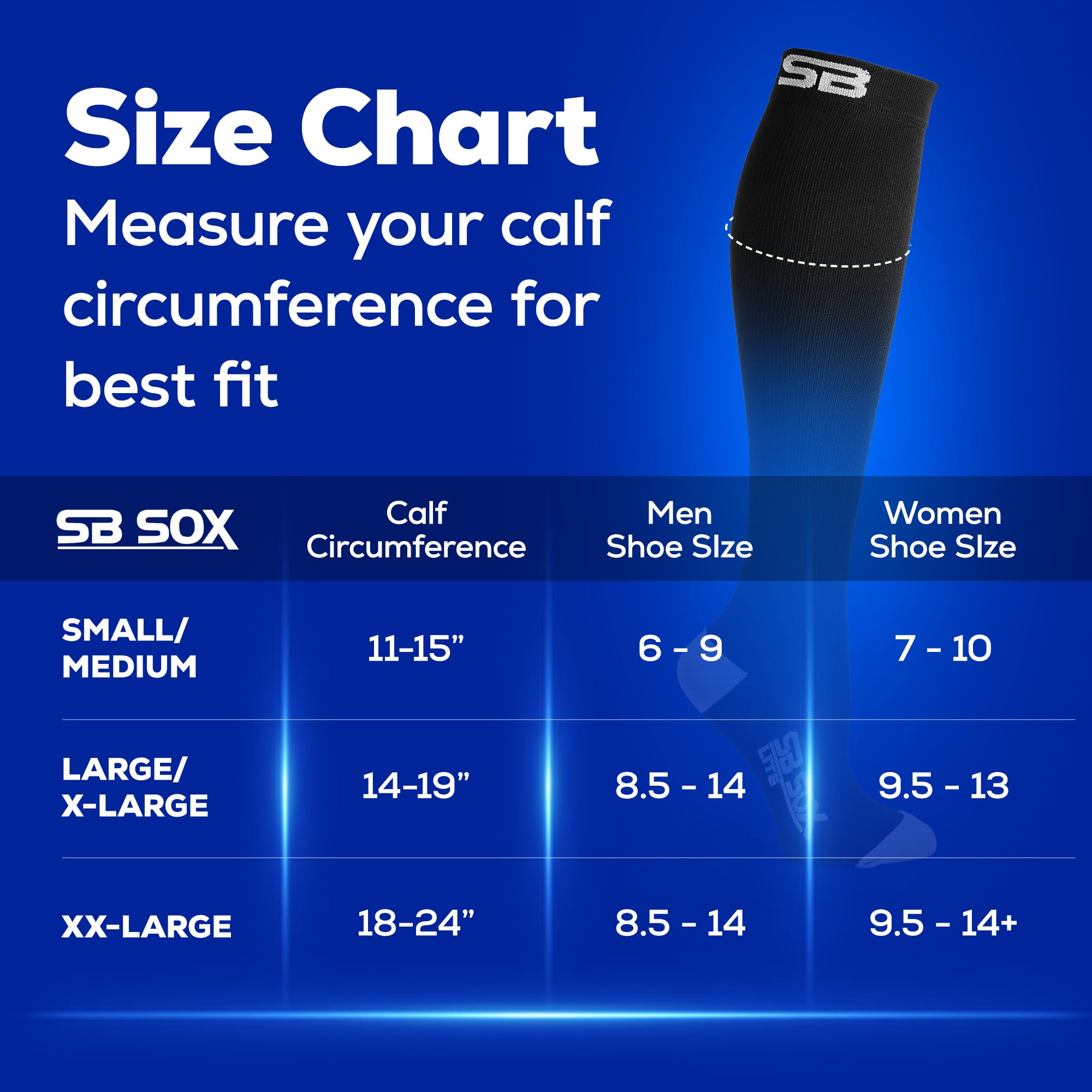π Measure your calf circumference and check your shoe size. Upsize if your shoe size is above the given range for your calf size. SMALL/MEDIUM: 11β15β calf | Menβs 6β9 | Womenβs 7β10; LARGE/X-LARGE: 14β19β calf | Menβs 8.5β14 | Womenβs 9.5β14+; XX-LARGE: 18β24β calf | Menβs 8.5β14 | Womenβs 9.5β14+