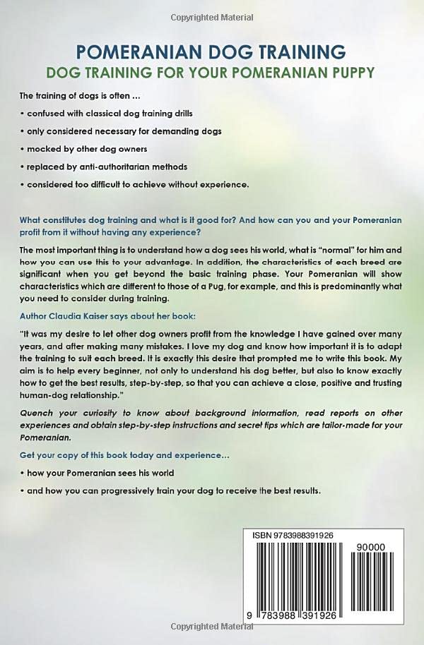 Pomeranian Dog Training - Dog Training for your Pomeranian puppy The training of dogs is often... ... confused with classical dog training drills ... only considered necessary for demanding dogs ... mocked by other dog owners ... replaced by anti-authoritarian methods ... considered too difficult to achieve without experience. What constitutes dog training and what is it good for? And how can you and your Pomeranian profit from it without having any experience? The most important thing is to understand how a dog sees his world, what is “normal” for him and how you can use this to your advantage. In addition, the characteristics of each breed are significant when you get beyond the basic training phase. Your Pomeranian will show characteristics which are different to those of a Husky, for example, and this is predominantly what you need to consider during training. This book is vol. 1 of the Pomeranian training books. Vol. 2 for your grown up Pomeranian is also available on Amazon with the title "Pomeranian Training Vol. 2: Dog Training for your grown-up Pomeranian". Vol. 3 for caring of your Pomeranian is available with the title "Pomeranian Training Vol 3 – Taking care of your Pomeranian". Author Claudia Kaiser says about her book: “It was my desire to let other dog owners profit from the knowledge I have gained over many years, and after making many mistakes. I love my dog and know how important it is to adapt the training to suit each breed. It is exactly this desire that prompted me to write this book. My aim is to help every beginner, not only to understand his dog better, but also to know exactly how to get the best results, step-by-step, so that you can achieve a close, positive and trusting human-dog relationship.” Quench your curiosity to know about background information, read reports on other experiences and obtain step-by-step instructions and secret tips which are tailor-made for your Pomeranian. Get your copy of this book today and experience... ... how your Pomeranian sees his world ... and how you can progressively train your dog to receive the best results. Your Pomeranian will appreciate it... ... so this is my advice: Don't hesitate to buy this book! Content of this book: What you need to know about your Pomeranian Cornerstones of training puppies What must your Pomeranian learn? The Basics How do you achieve that? Conclusion Before the puppy arrives The main relationship Privileges The time factor The first few weeks Getting your puppy to understand you Getting him used to his new surroundings Building a relationship How to get your puppy housetrained The first commands Feeding Sit Lie down Finish exercise How to avoid undesirable behaviour Biting Jumping up Restlessness Fear of riding in cars Destructiveness Training basic knowledge Walking on the lead Walking to heel Calling your dog Stay Sit at a distance Giving something up Putting the lead on and taking it off Special Chapter – The hunting instinct Keep him busy Be prepared to distract Study alternative behaviour Reinforce Obedience Check list for the start Preliminary considerations Buying your Dog Formalities: Shopping List Puppy-safe environment Conclusion