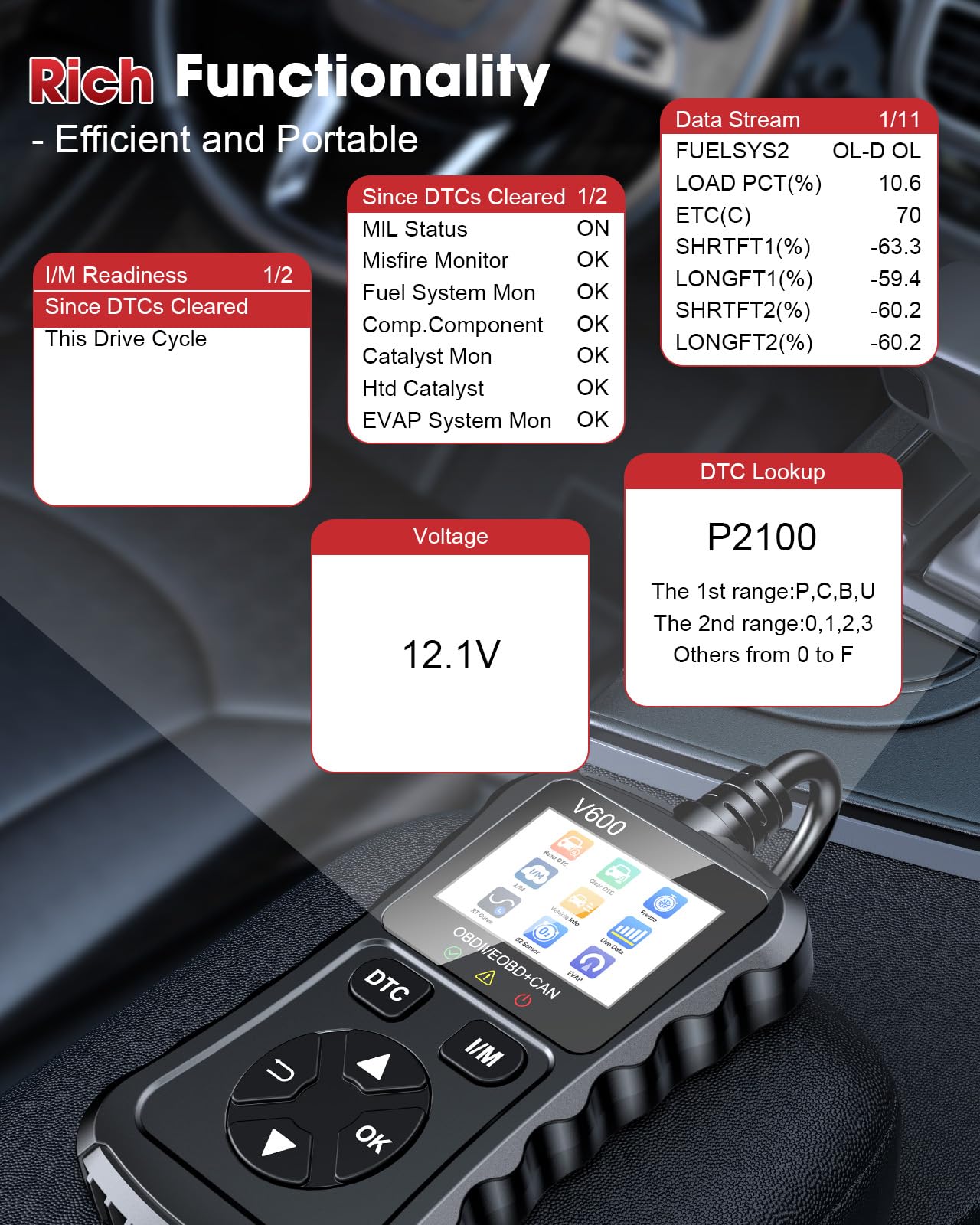 Excellent-Structured and Beginner-Friendly: Made of high-quality impact-resistant materials, this engine code reader eatures a sturdy non-slip housing and a long, flexible cable for durability. Its compact and lightweight construction makes it easy to carry and store, and its bright color screen provides clear readability even in low-light conditions. Equipped with 6 intuitive operation buttons, dedicated I/M and DTC shortcut keys and a plug-and-play design allow users to easily navigate menus and perform diagnostics with minimal effort. Even if you are a beginner in mechanical tools, this easy-to-operate OBD2 scanner can provide you with efficient and convenient service.