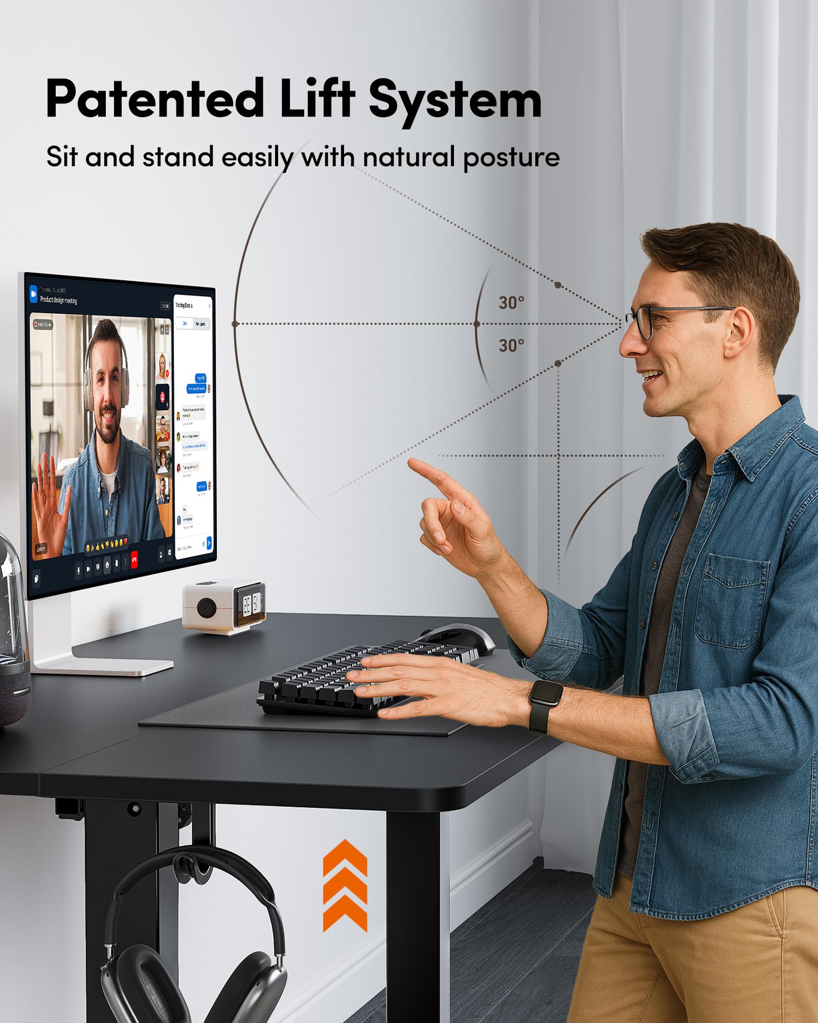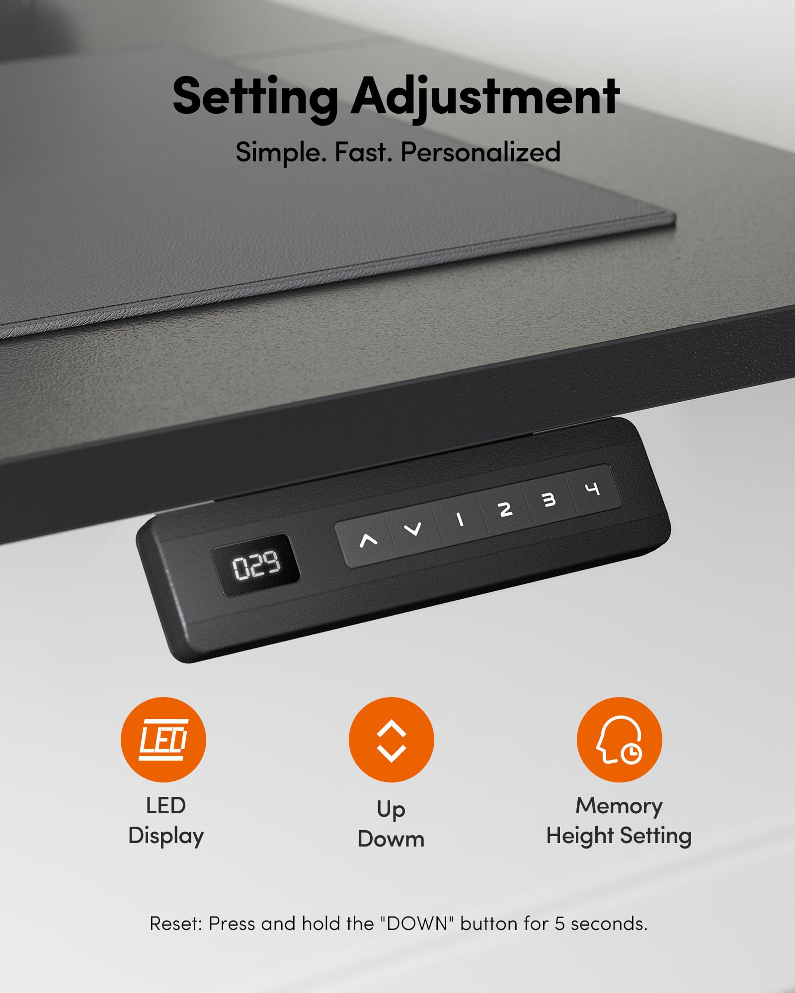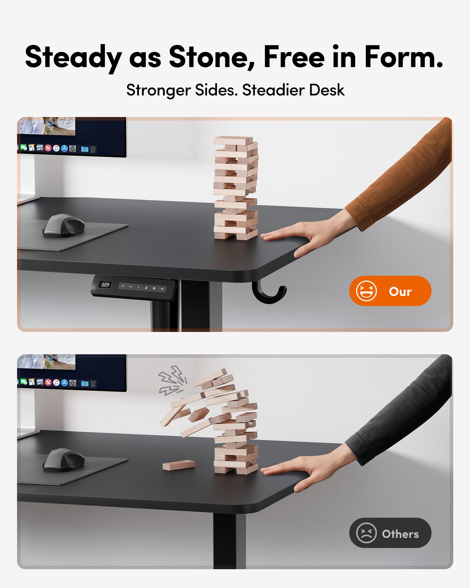 Memory Height & Anti-Collison Technology: Standing desk has 2 programmable memory height buttons. If the adjustable desk encounters obstacles when lifting, it will move 2cm in the opposite direction to avoid possible damage or injury