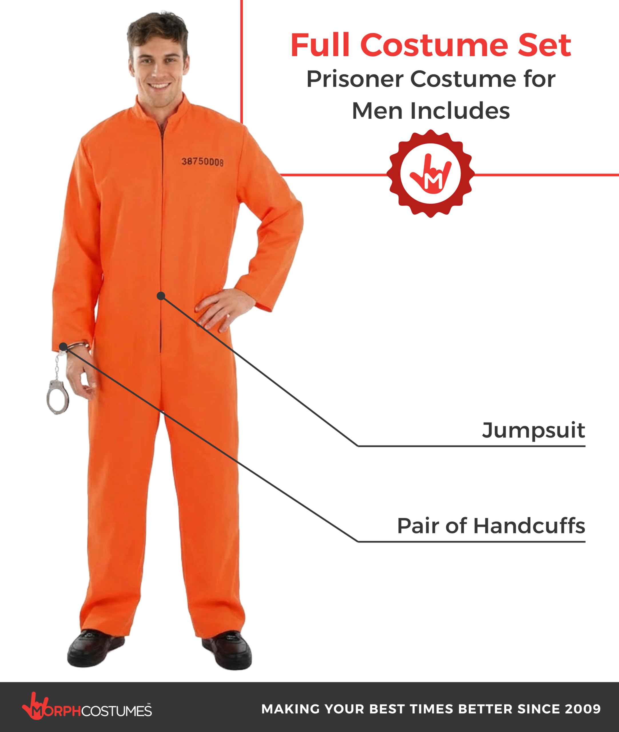 Prisoner costume men includes an orange boiler suit, complete with silver handcuffs to finish this prisoner outfit.