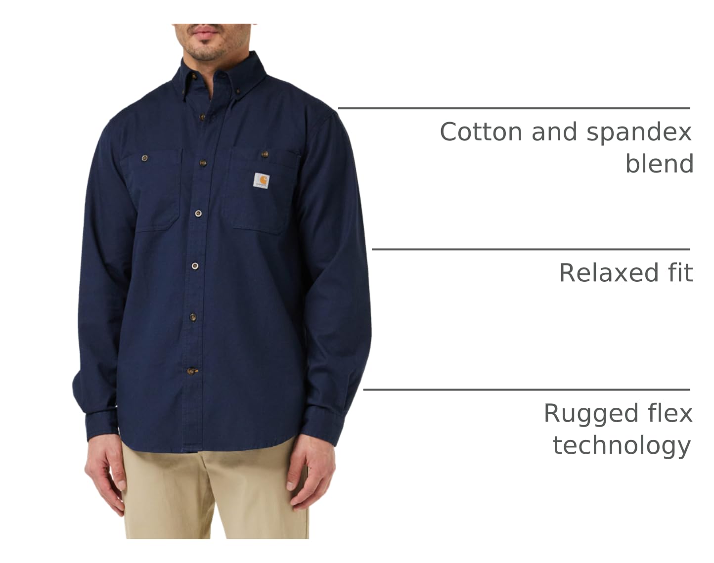 Description This durable work shirt comes standard with built-in stretch, so whatever you're doing, it's easier to do. Relaxed fit 6.5-Ounce, 98% cotton/2% Spandex rugged flex technology for ease of movement two chest pockets with additional left-chest pocket panel for added storage button-down collar two-button adjustable cuffs with extended plackets faux horn buttons drop-tail hem for additional coverage Carhartt-strong triple-stitched main seams imported