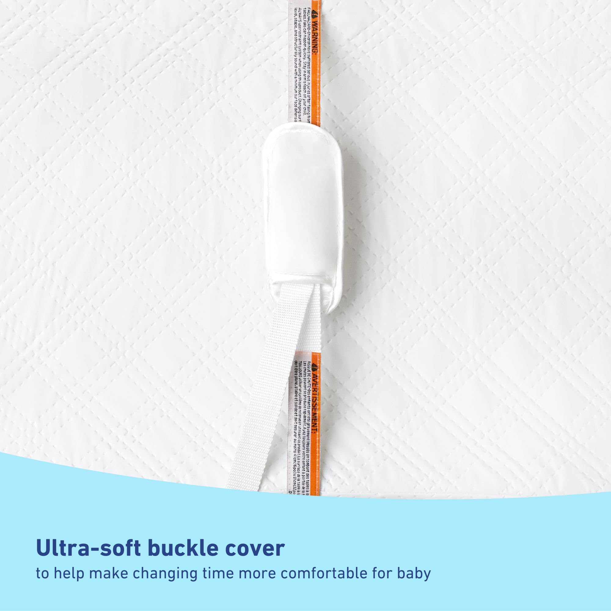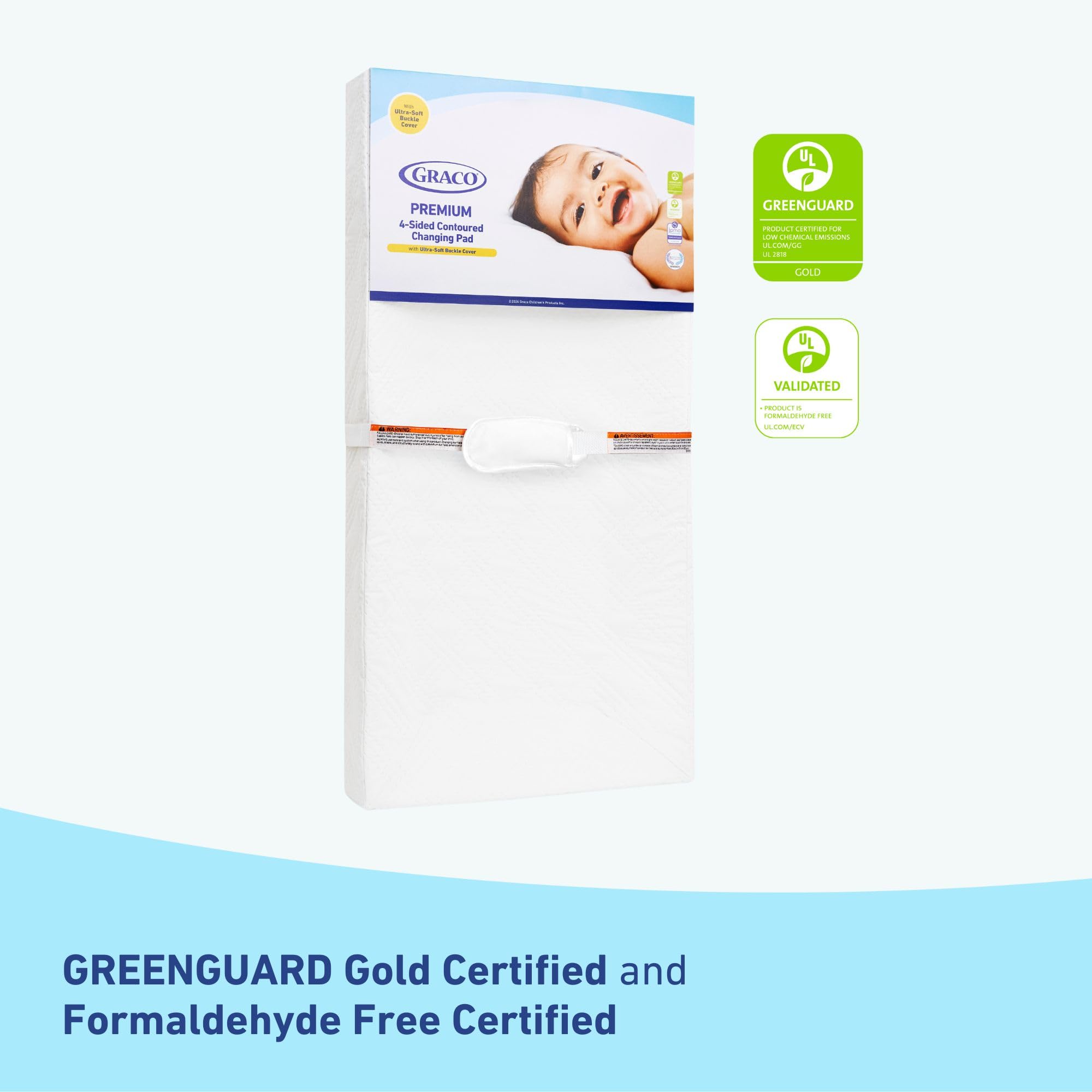 The Graco Premium 4-Sided Contoured Changing Pad is designed to make changing your baby a clean, comfortable, convenient, and secure process. It is GREENGUARD Gold Certified, Formaldehyde-Free Certified, and JPMA Certified—developed with your family in mind. For added safety, this premium changing pad features four contoured walls and a safety belt to help keep your baby in place. To enhance comfort, it includes Graco's signature plush, ultra-soft buckle cover, designed to protect your baby's skin from accidental pinching while providing a super-soft, ultra-comfortable feel. Made of durable, water-resistant, PVC-free PEVA material, the Graco Premium 4-Sided Contoured Changing Pad is easy to wipe clean. It also includes two safety straps to secure the pad to your changing surface, along with a non-skid bottom to help keep it in place. Designed to fit most standard changing toppers (16 inches x 32 inches, up to 30 pounds), this pad meets or exceeds all applicable ASTM International and CPSC safety standards. Backed by a 1-year limited manufacturer’s warranty. No assembly required. Manufactured by Storkcraft—proud licensee of the Graco brand for changing pads.