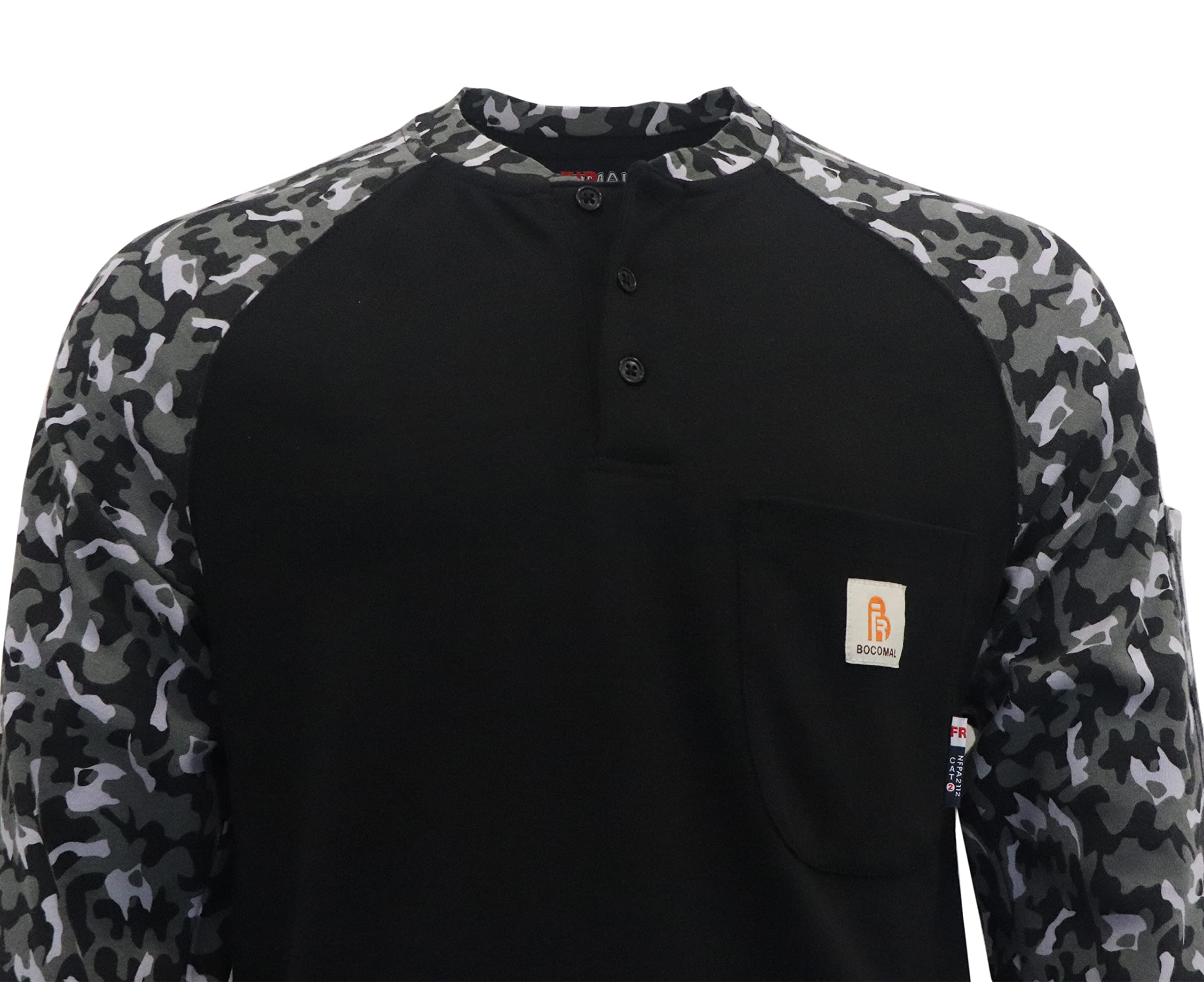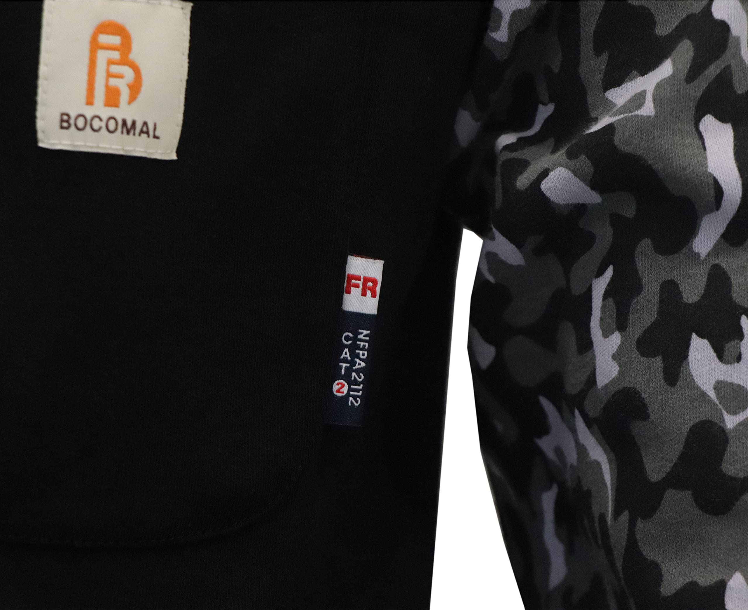 FR MATRIALS:7OZ Cotton printed Knit FR Treated,FR Buttons,FR Sewing Threads!Clear FR Tag on arms and bottom front.More FR info On Neck Tag About UL Certification.We Attached A Small Sample Inside Package For Cunstomers Simple FR Try