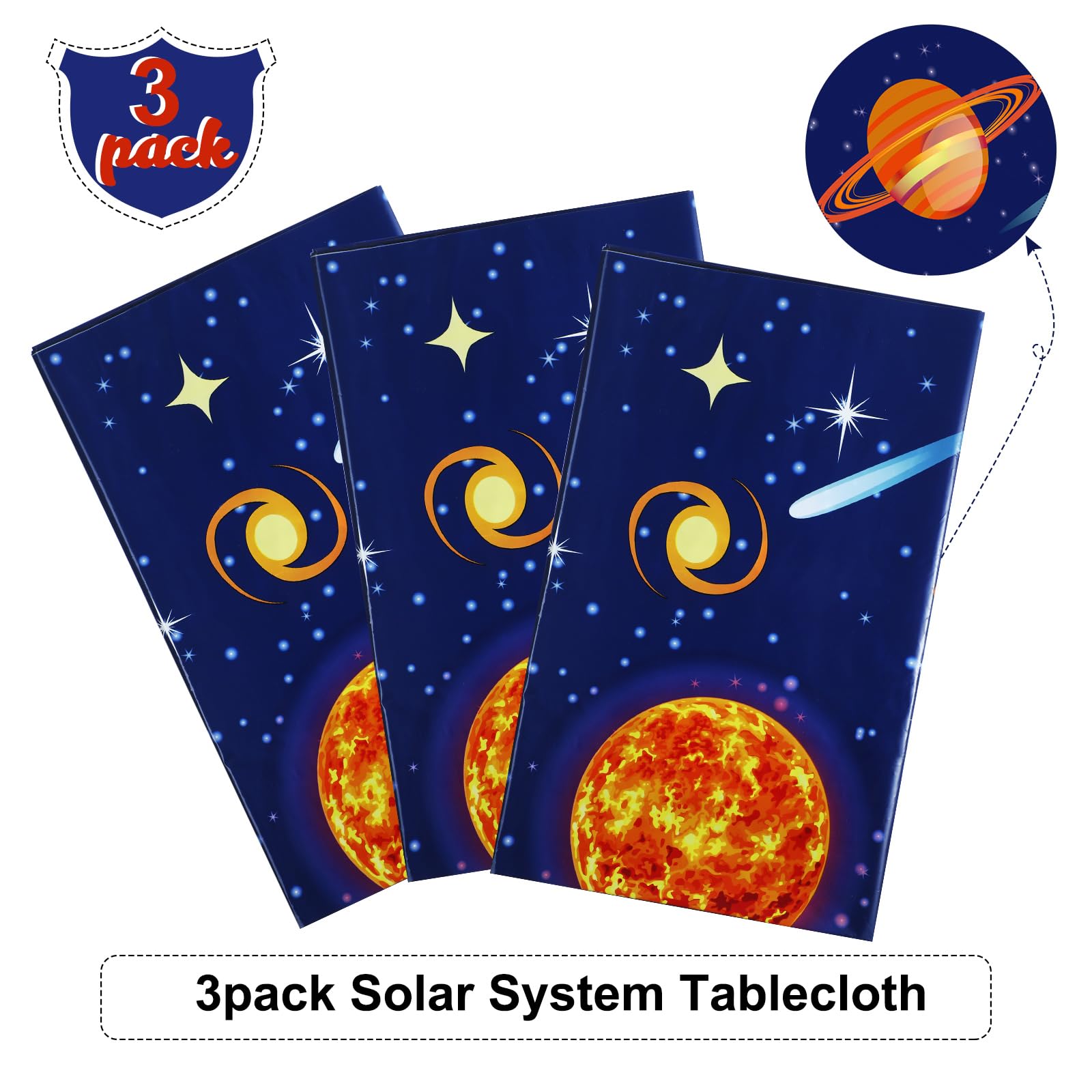 Package includes: 3 pieces space rectangular tablecloth table cover, designed with planets and stars on a dark blue background, ideal for decorating at classrooms or any space themed party