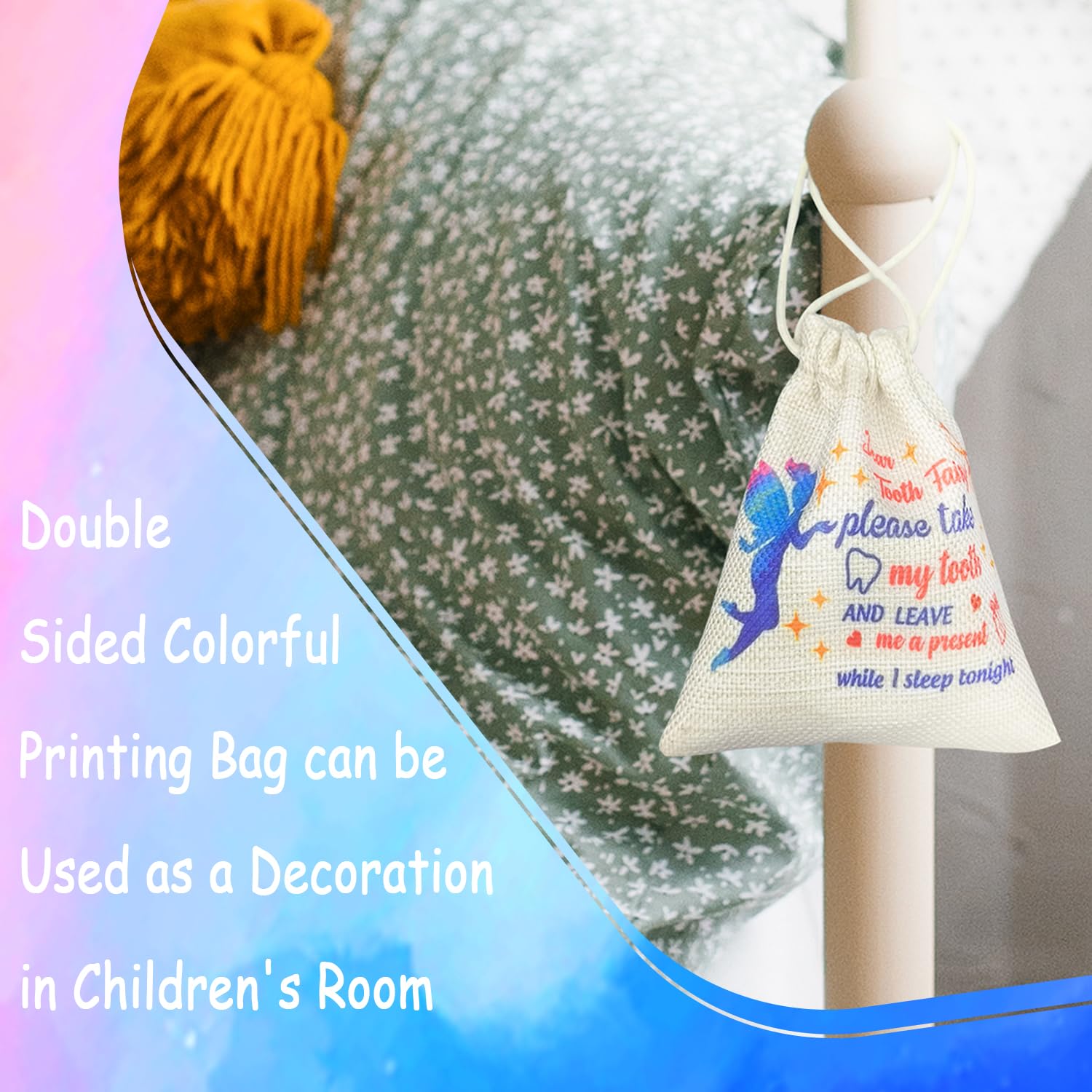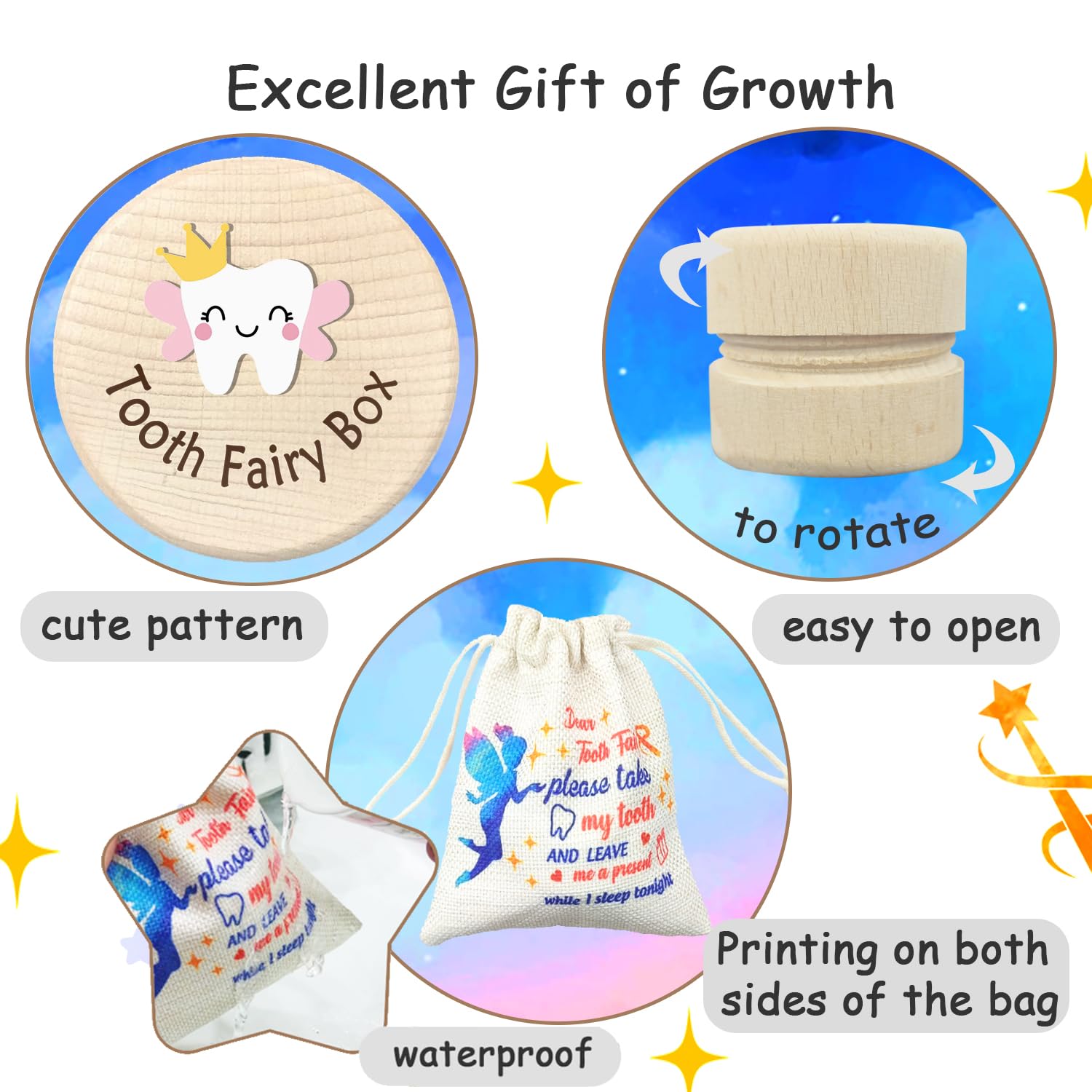 ๐ฆท Exquisite pattern๏ผ The tooth fairy wooden box is exquisitely designed, and there is a three-dimensional colorful printed white tooth on the lid, which is beautiful and lovely. The engraved 'Tooth Fairy Box' text on the wooden box lid can let others know what the box is for.The tooth fairy bag is double-sided color printed. Perfect size for keeping as a keepsake.