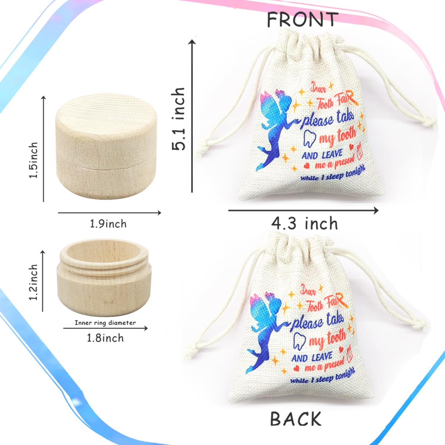 ๐ฆทAbout Baby Teeth Storage Box Set: The outer size of the tooth loss fairy box is 2*2*1.4 inches, and the inner size is 1.6 x*1.6*1 inches. It can be used to store extracted teeth, or it can be placed under a pillow. The tooth fairy keepsake wooden box is made of natural wood, which is durable and not easy to break, the size of tooth fairy bag is 4.3*5.1 inches (approximately)