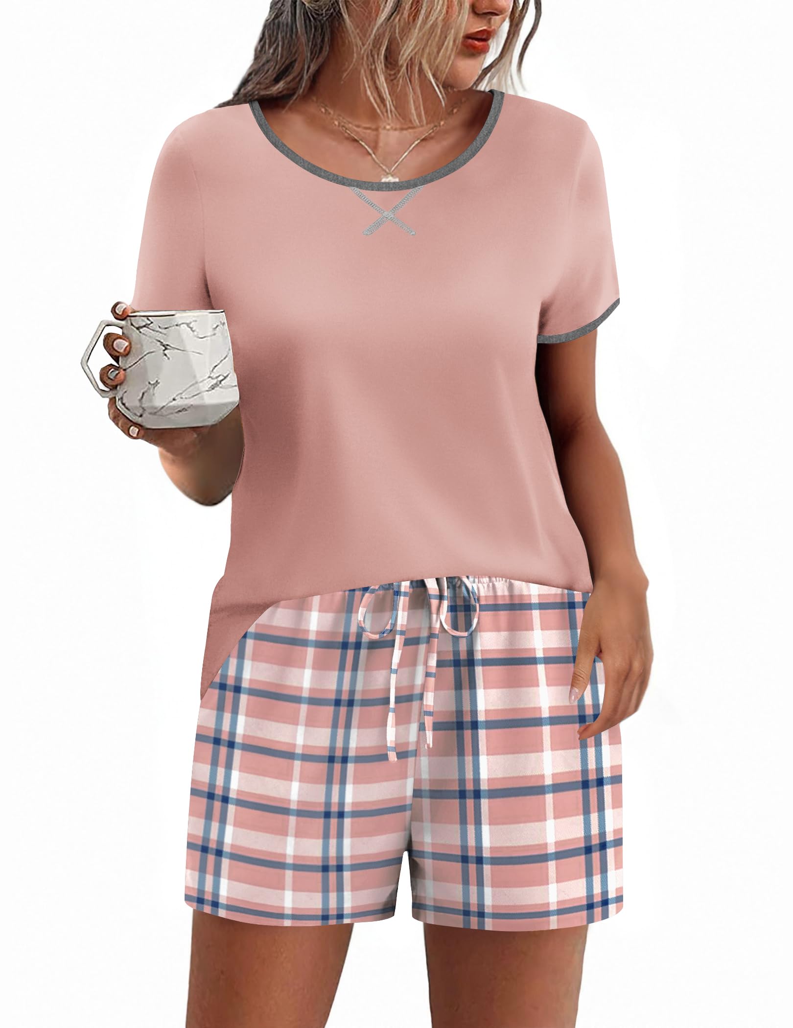 Two Piece Pajama Set: Top- with Round-neck,short sleeve,stylish color block, Pj Short- with Elastic waist,classic plaid & print,which suitable for every age group. Nice design Short Pajama Set for a relaxing day and night