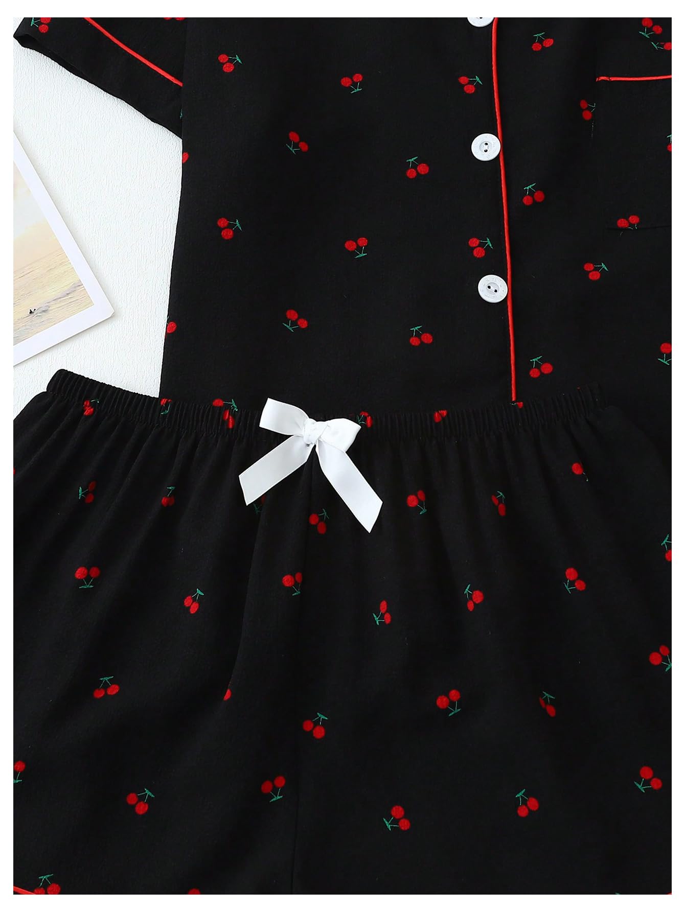 Lapel Collar, Short Sleeve, Print Pajamas, Bow Decoration, Button Down Top and Shorts, Loungewear Sets, Women's Sleepwear.
