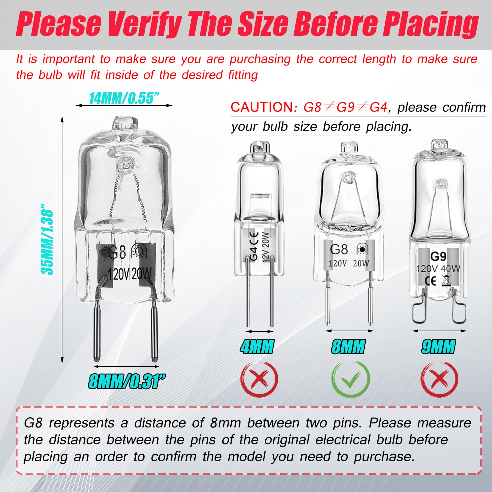 Specifications:G8 bi-pin base, 120 Volt, 20 Watt, 2800k warm white, 1.38" in length, 0.55" in width.Dimmable and adjusts with high and low switch setting