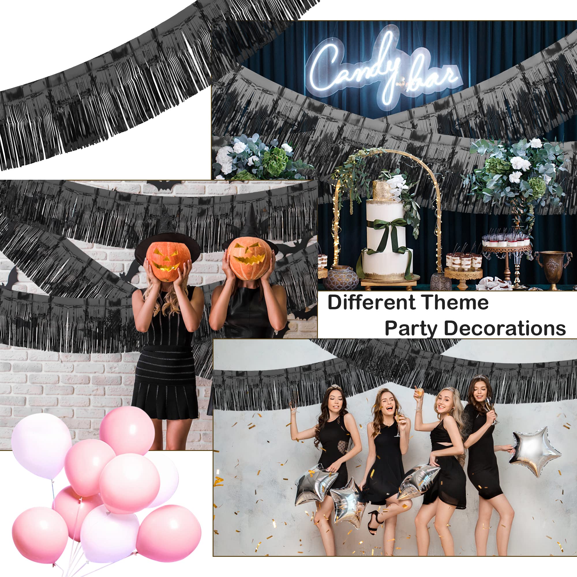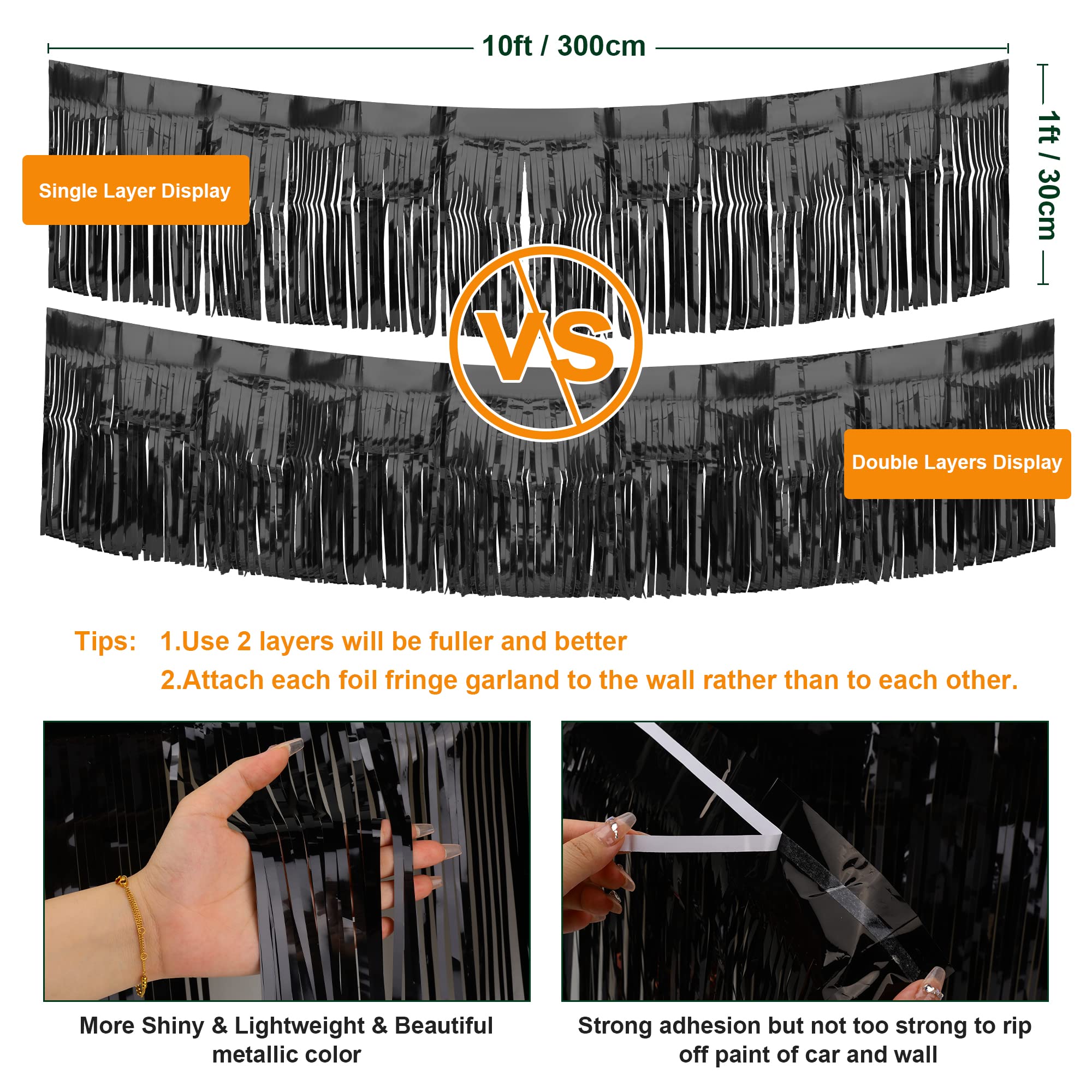 【PACKAGE INCLUDES】Comes with 4 packs of BLACK foil, 10*1 ft/3*0.3m (L*W ), You can cut it into any size to meet your decoration needs. If you want parade float decoration to be colorful, fuller, thicker and looks better, it is better to use more than 2 packs of fringe float overlapping together. And tape each foil fringe garland on the car/wall, not on top of each other. With these festive metallic streamers, you can take your parade float decorations to the next level.