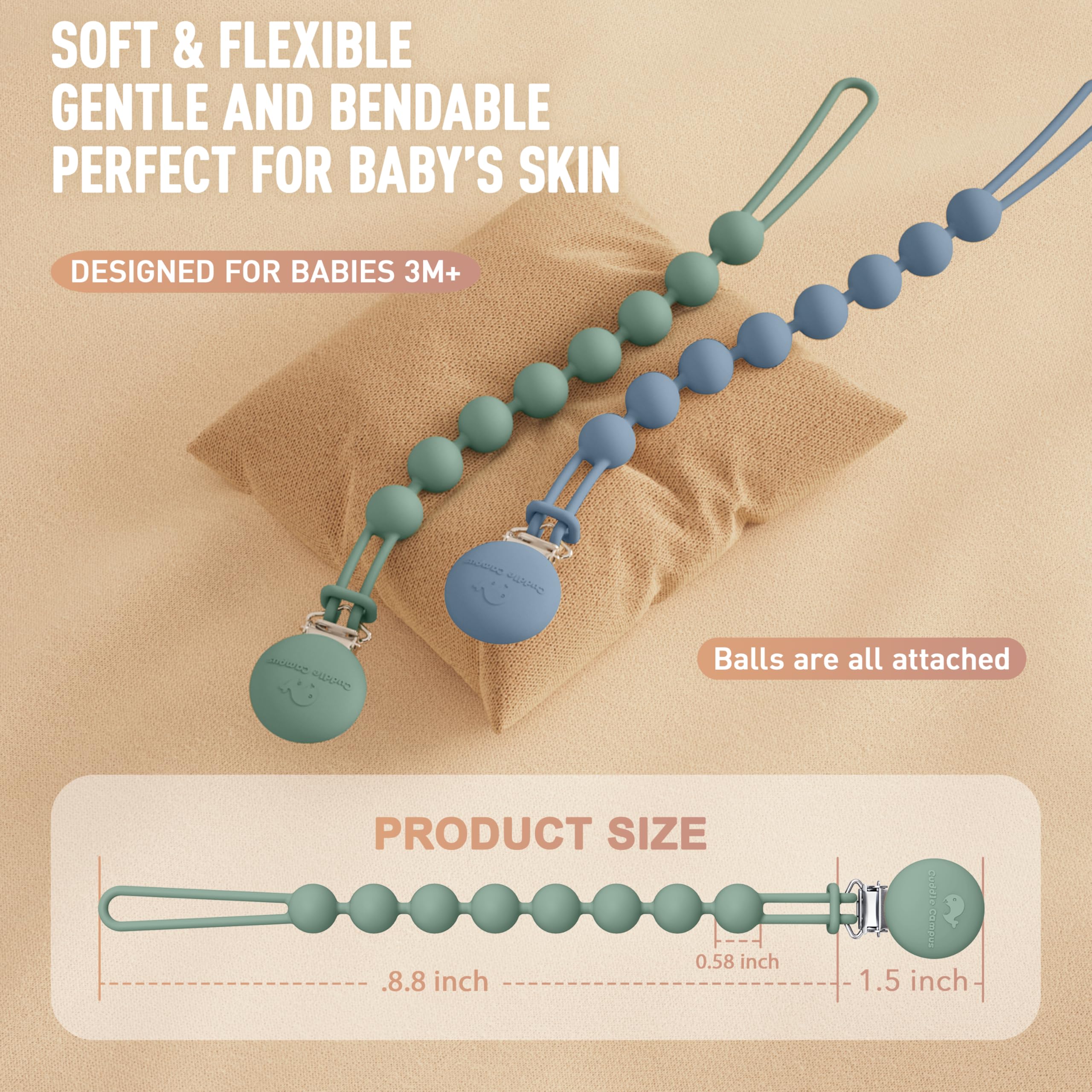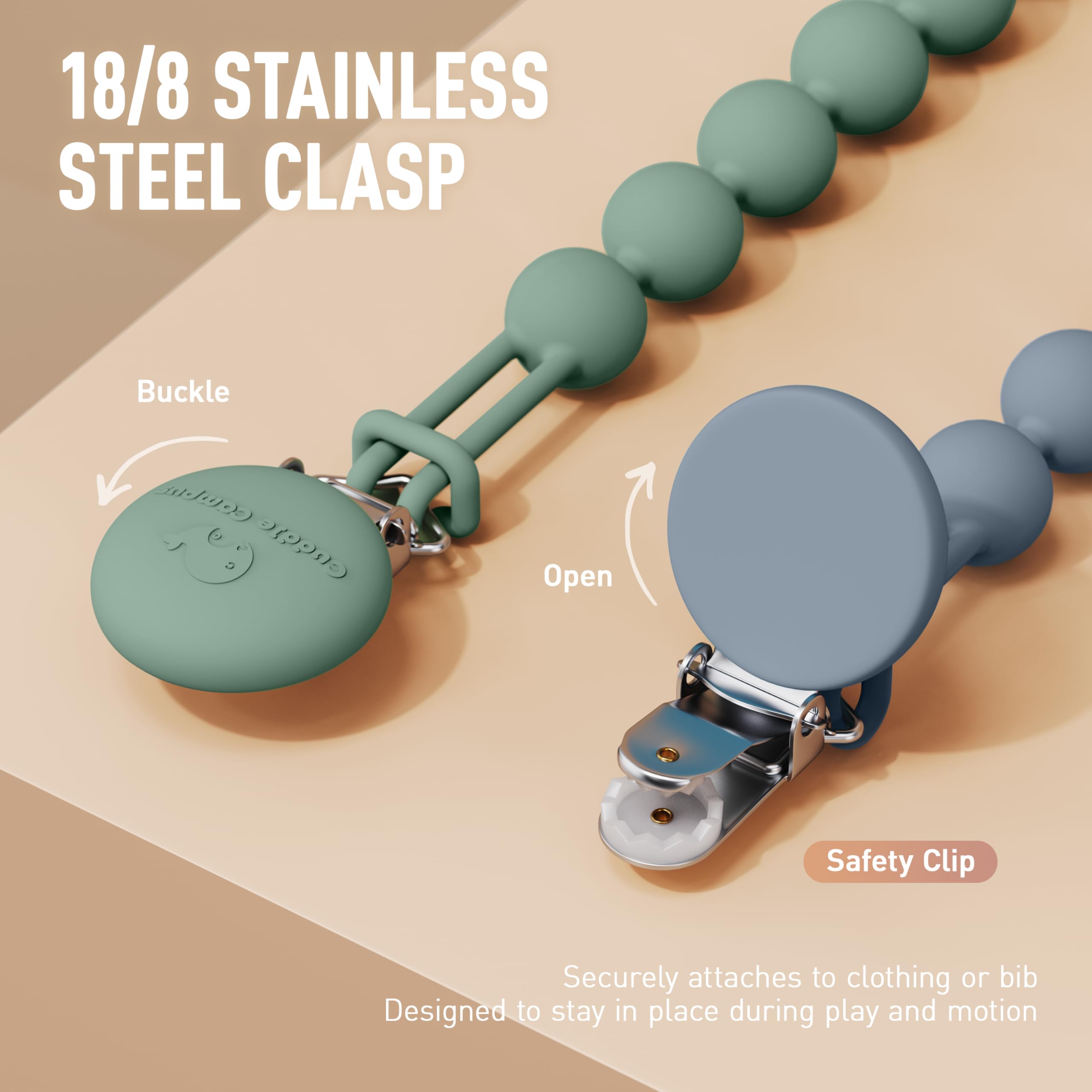 FOOD GRADE SILICONE: The beads of our pacifier clip are made from 100% pure food-grade silicone—a material we carefully pick for its dependable safety, letting you use the clip with total ease