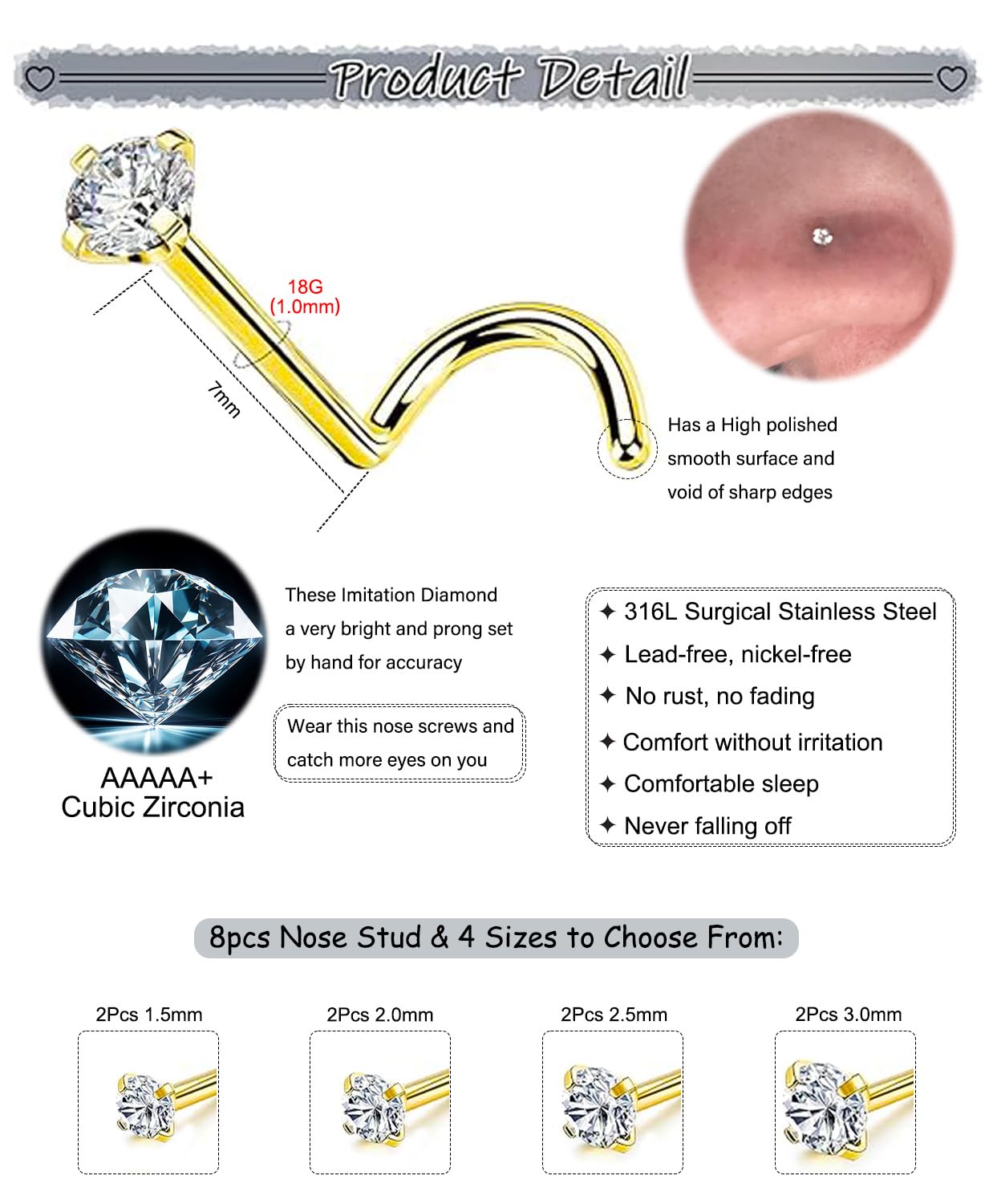 Multiple Size Sets: 8pcs nose studs in a set, All Gauge--18G(1.0mm); Pin Length: 7mm; Cubic Zirconia Size: 1.5/2/2.5/3mm. 18 gauge studs earrings perforation size suitable for most people