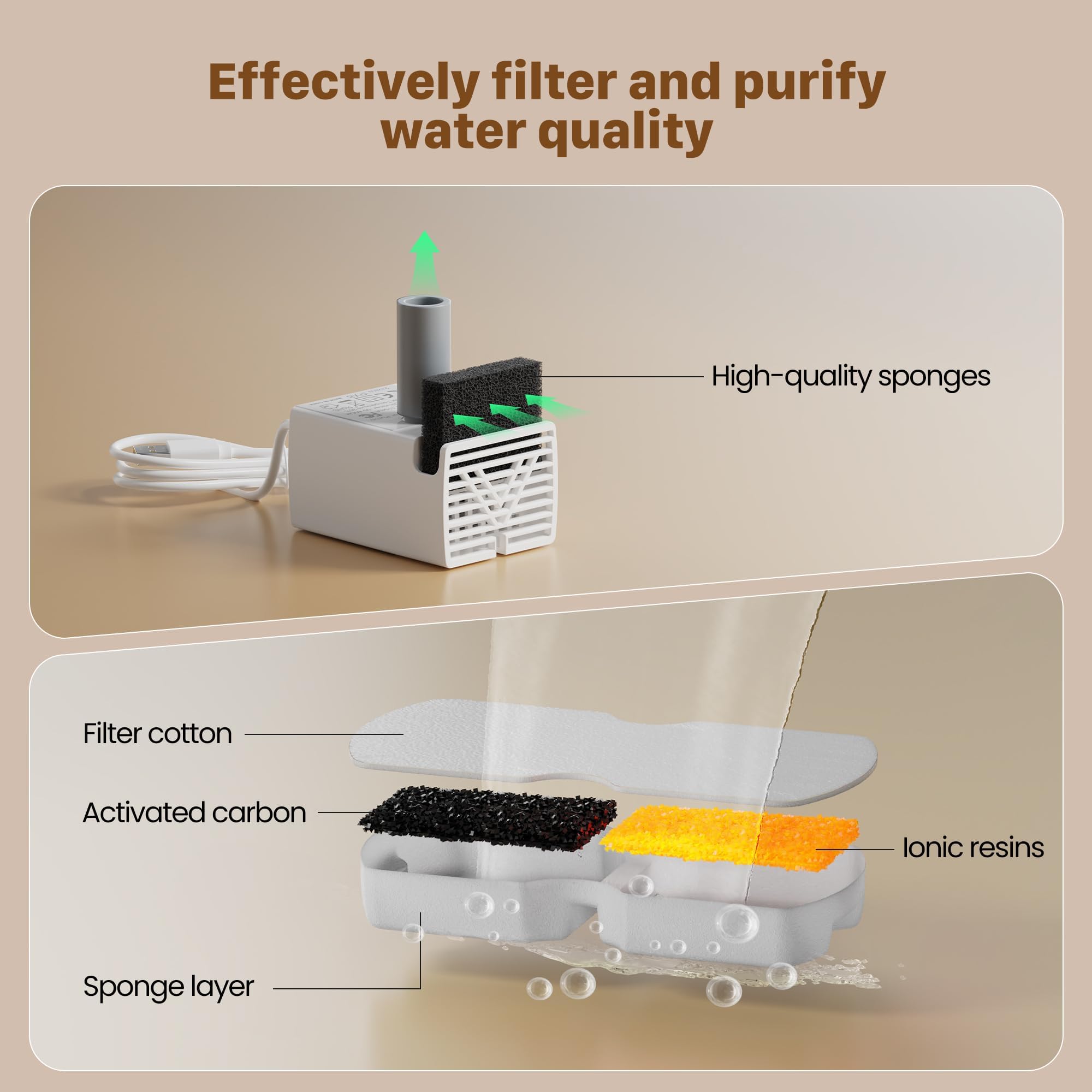 【Suggestions for use】Before use, soak the filter with water for 5 minutes to remove dust. Changing the filter every 2-4 weeks is good for keeping the water clean and improving the pet's drinking experience