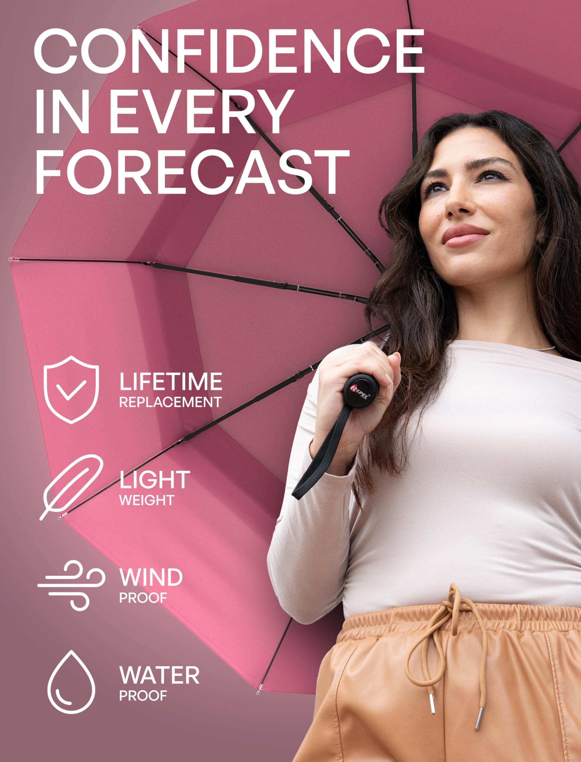 AWARD-WINNING WINDPROOF DESIGN: Engineered to outperform ordinary umbrellas, this compact folding umbrella withstands extreme conditions with reinforced fiberglass ribs, a vented canopy, and strong fabric. Tested to 85MPH, Repel is resistant to flipping and breaking where others fail. Portable and sturdy, it expands wide for large coverage against rain, UV light, and storms, making it the strongest and most dependable travel essential accessory or a classic gift.