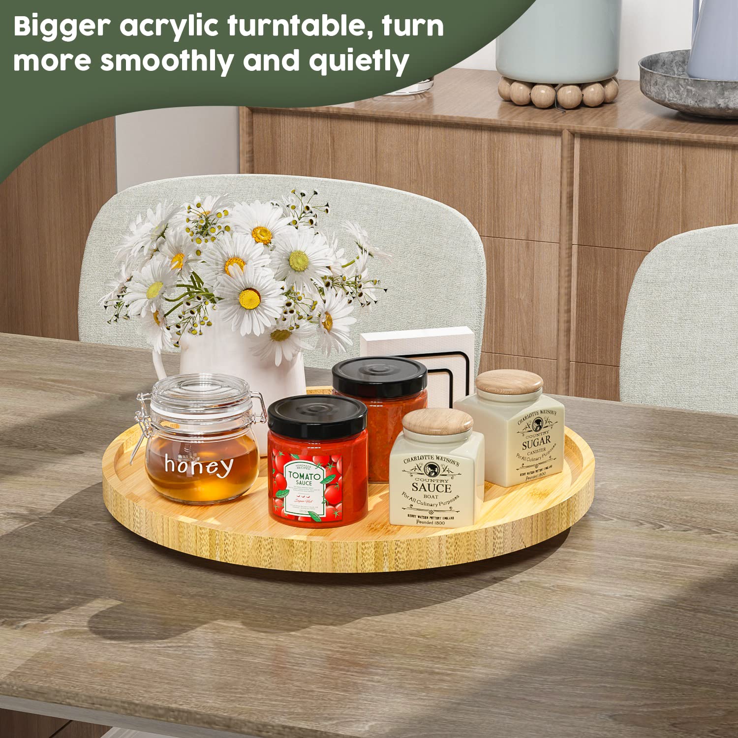 Updated Design: Bigger acrylic turntable with 3 silica gel skid prevention pad makes lazy susan organizer rotate smoother and quieter. You can get any item from any angle. The additional lip prevents items from falling off
