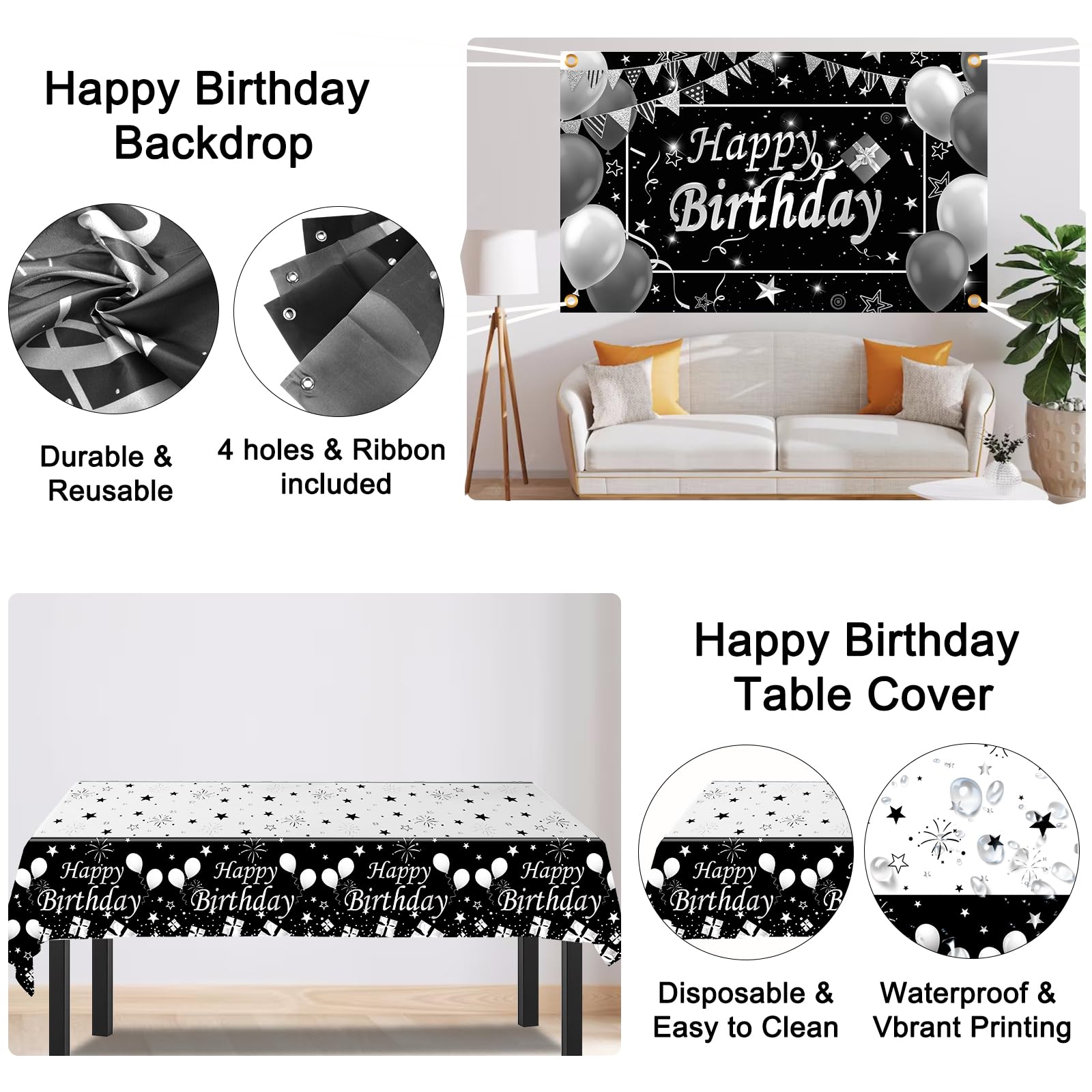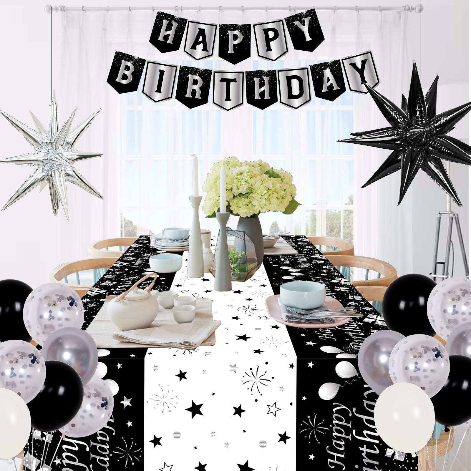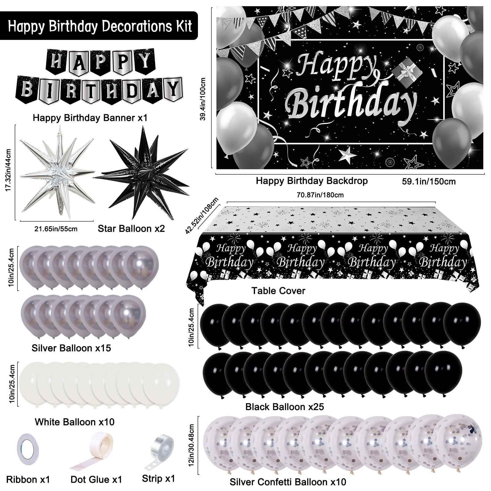 Black and Silver Birthday Decorations Kit --- Includes 10" latex balloon 50pcs (black balloons 25pcs, silver balloons 15pcs, white balloons 10pcs ), 12" silver confetti balloons 10pcs, happy birthday backdrop cloth 59.1 x 39.4in (150x100cm), happy birthday banner 1 kit, happy birthday table cover 1pcs, black and silver star foil balloons 1pc each, sticky dots, strip and ribbon.