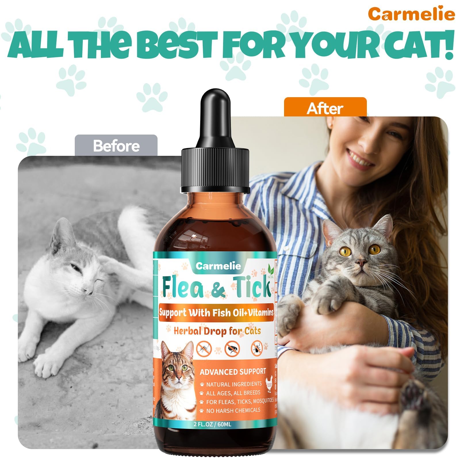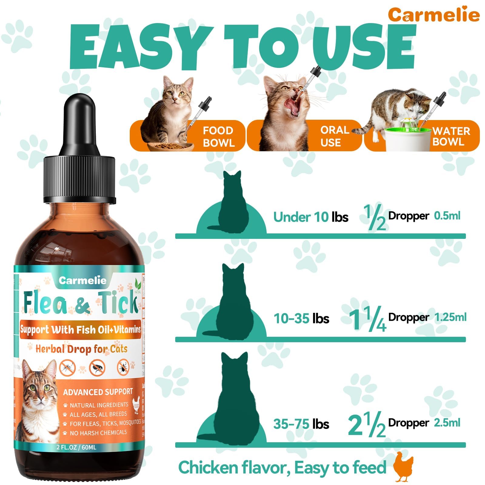 Supplement with Vitamins & Fish Oil: Enriched with vitamins B1, B6, B12 and fish oil, carrot juice, these liquid drops not only help with flea, your cat will also enjoy a shiny coat and skin.