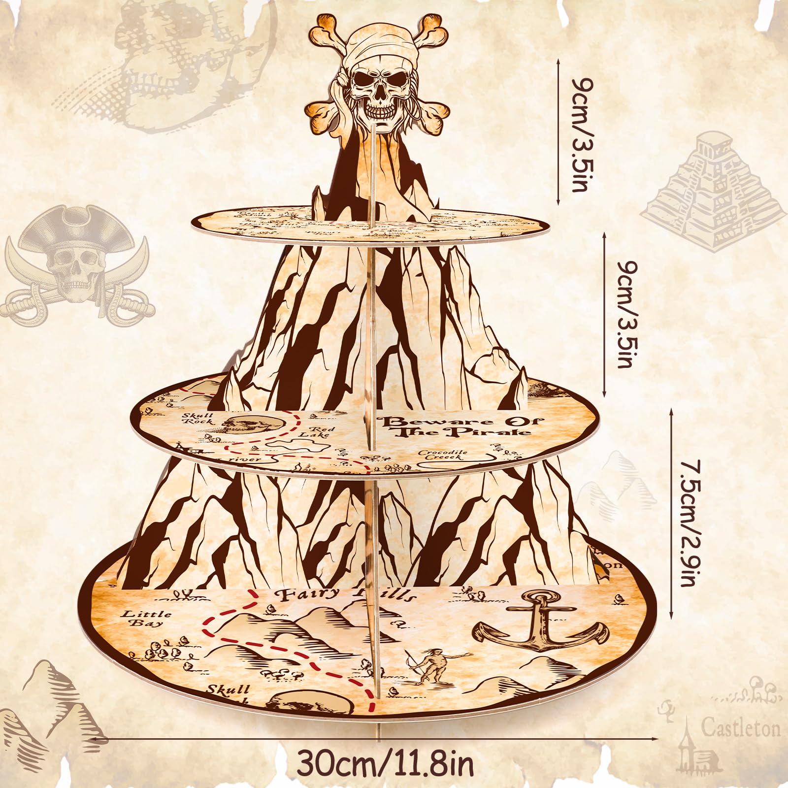 1.Pirate Theme Cake Stand: The top layer is about 7.1 inches in diameter, the middle layer is 9.4 inches in diameter, the bottom layer is 11.8 inches in diameter, the size enough and appropriate for you to accommodate cupcakes