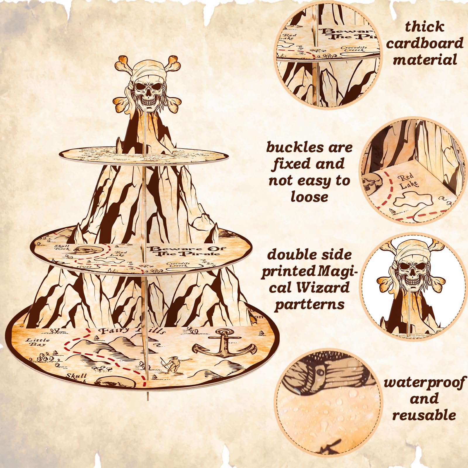 2.Pirate Theme Design: Our pirate's treasure map cupcake stands are design with skeleton, mountain, treasure chest pattern, It is an ideal decorations for your pirate-themed parties, will create a festival atmosphere for your party.