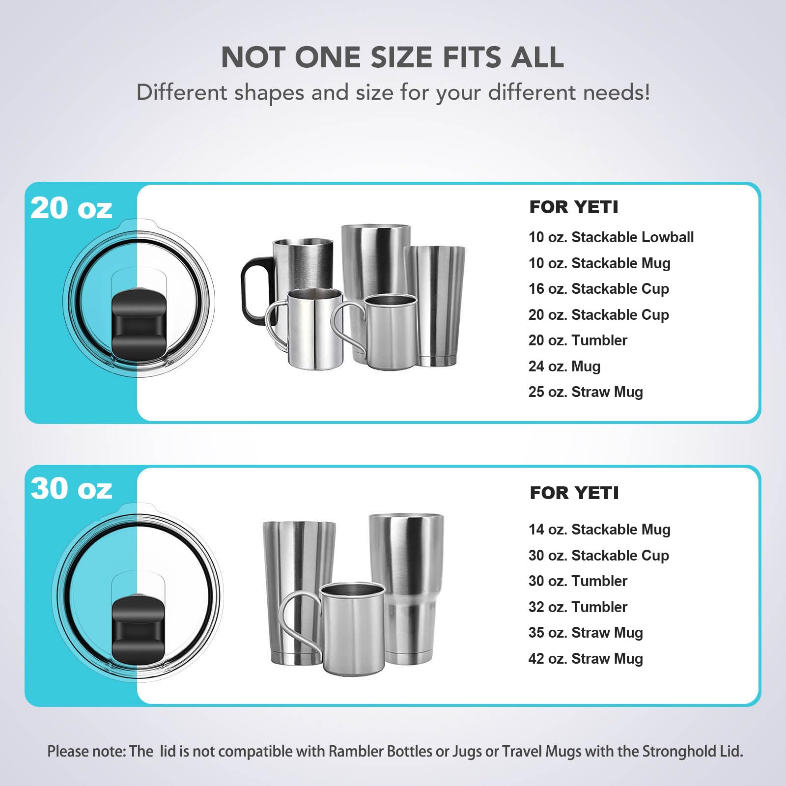 PERFECT REPLACEMENT: This magnetic cup lid is compatible with YETI 30/32 oz Tumbler, 14 oz Mug, 30 oz Cup and 35/42 oz Straw Mug. (Please note: This lid is not compatible with rambler bottles or jugs, or travel mugs with the stronghold lid.)