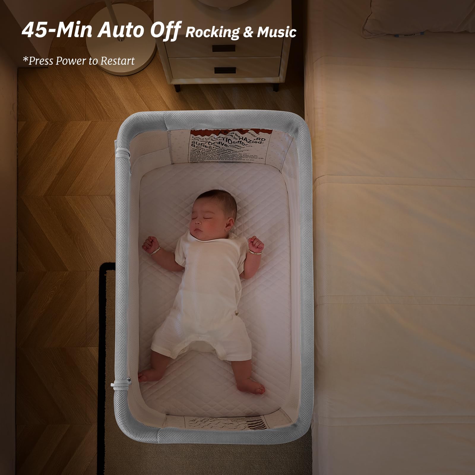 45-MIN AUTO SHUT-OFF: Rocking and music automatically stop after 45 minutes—no need to manually turn off during the night. Restart easily using the remote.