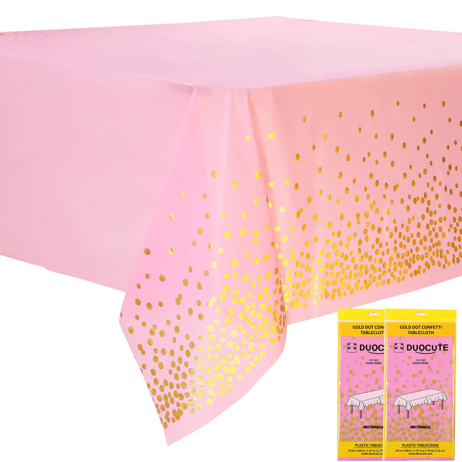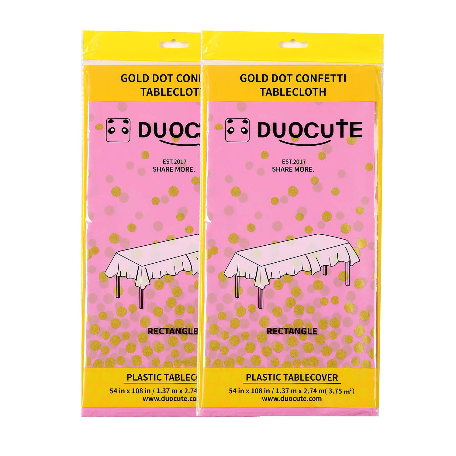 "The party tablecloth includes 5 different designs. Golden dot with Black, Golden dot with White, Golden dot with Blue, Golden dot with Pink, Rose gold dot with White. About DUOCUTE Duocute is committed to provide Premium Product for our millions of party lovers. Product Features : Size: Width x Length 54"" X 108"" / 137cm x 273cm Shape: Rectangle Material: Plastics PEVA Quantity: 2 Packs Ideal for Any Occasion: Baby showers, retirements, graduation, bachelorette parties, boys birthday parties, picnic, and afternoon tea parties."
