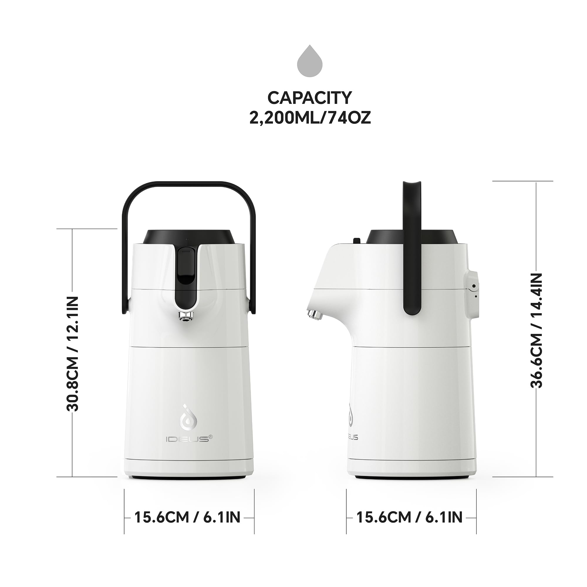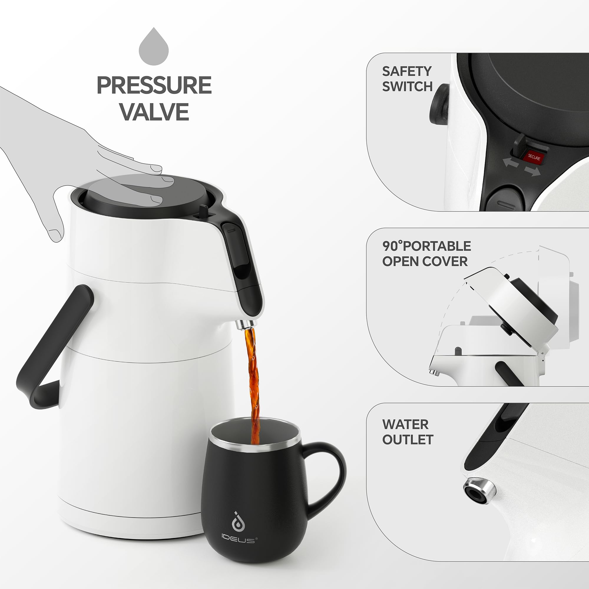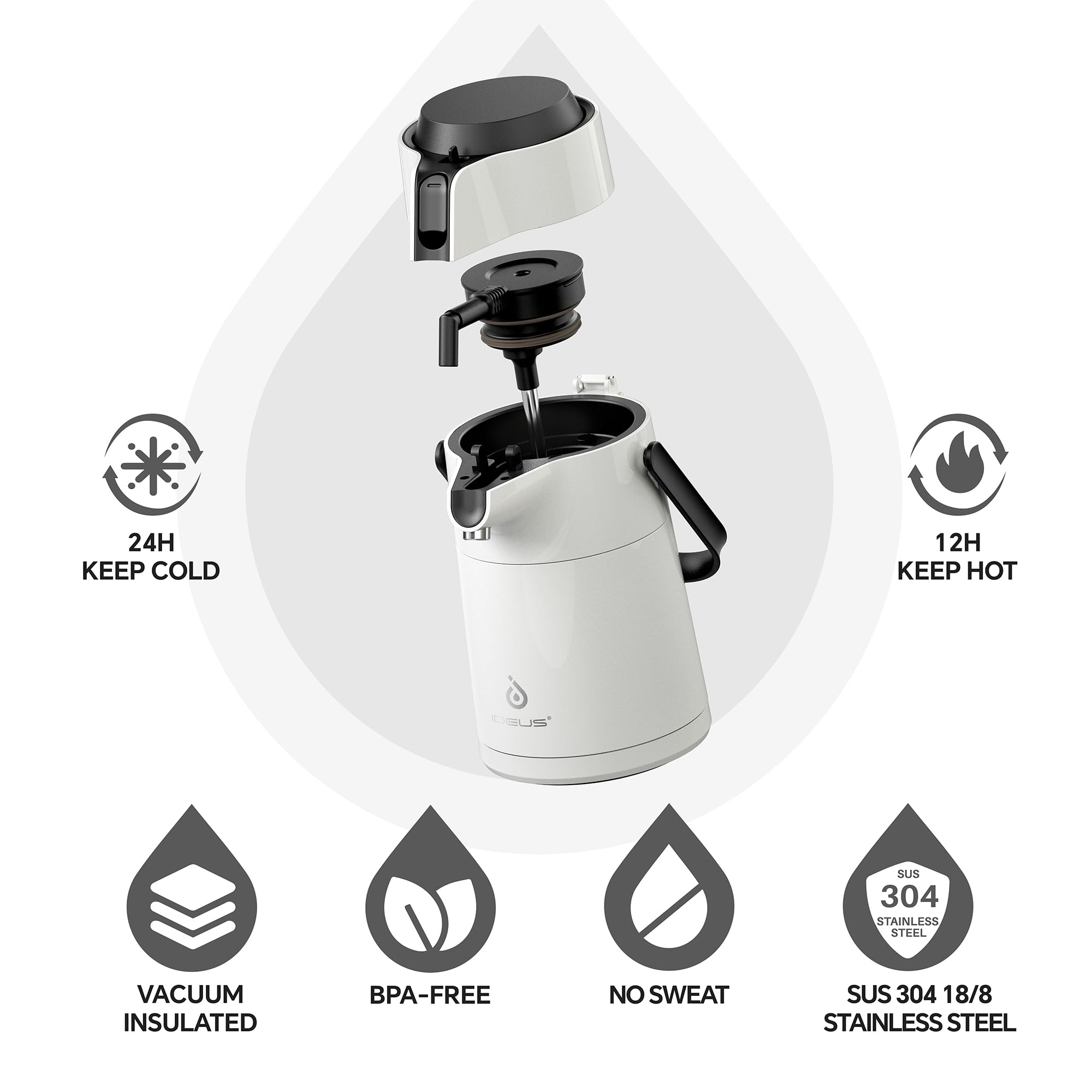 Vacuum Insulation - This type of coffee carafe from IDEUS is made from SUS304 18/8 stainless steel. 100% BPA-free. Advanced vacuum insulation technology can keep cold for up to 24 hours, and keep hot for up to 12 hours.With advanced vacuum insulation tech, you can keep the coffee or tea fresh and piping hot/cold.