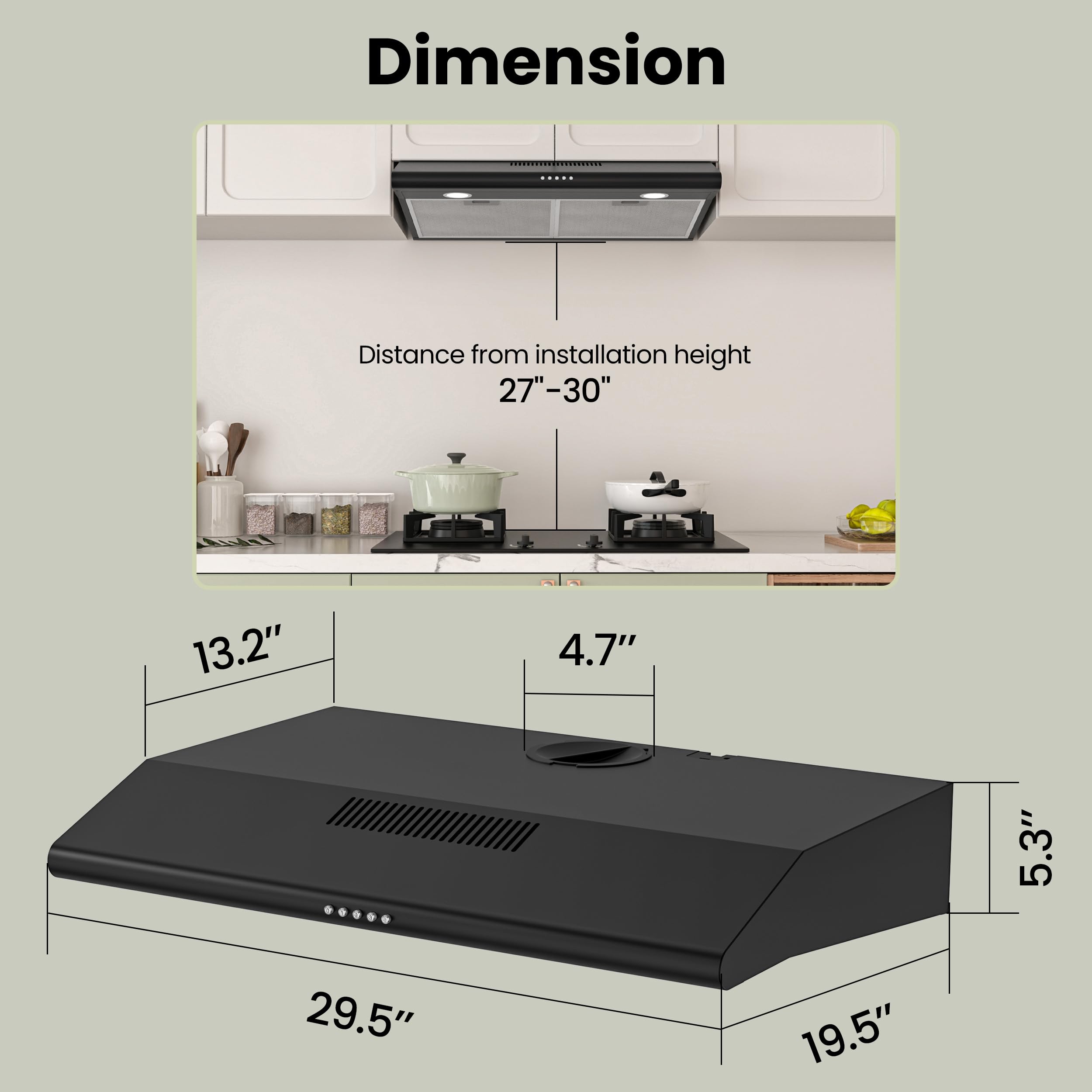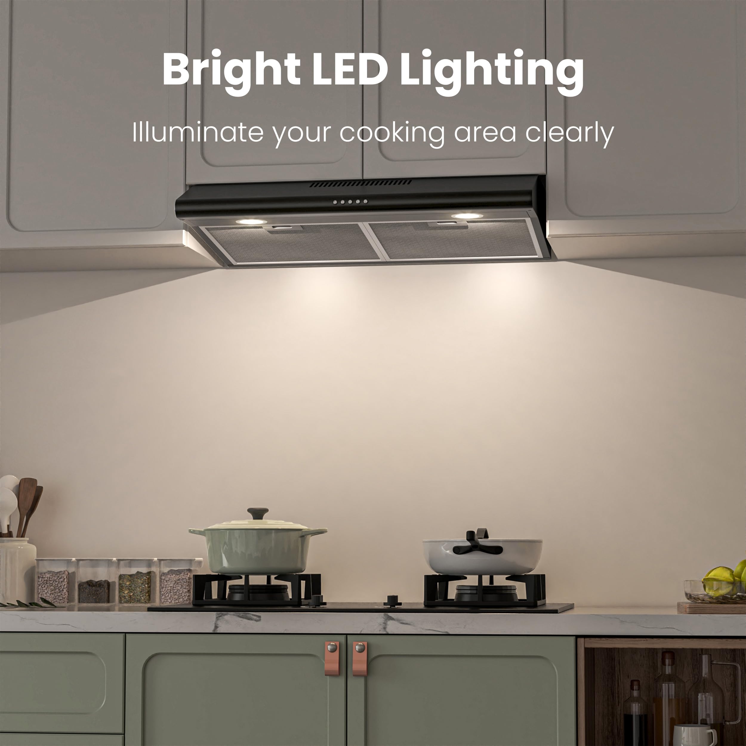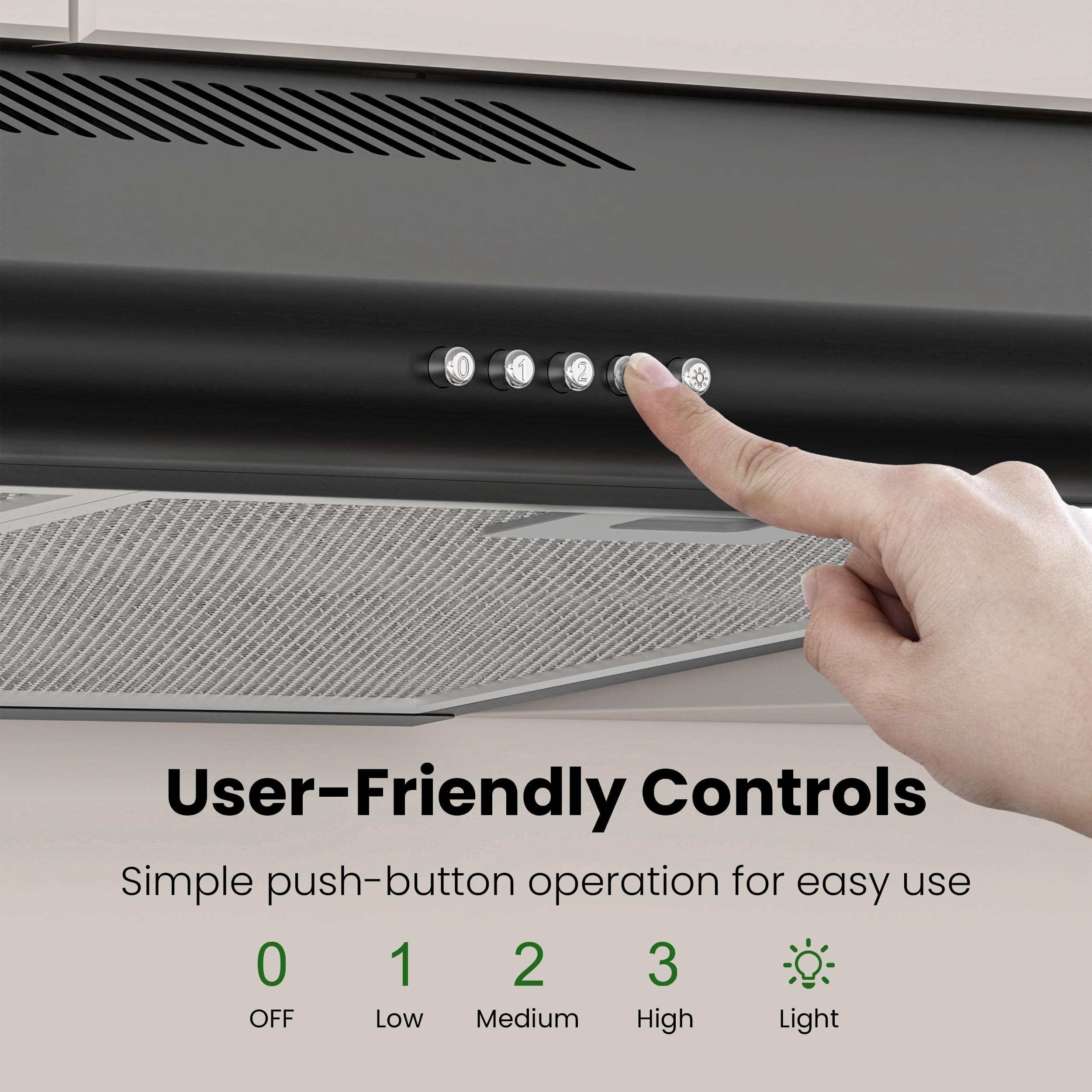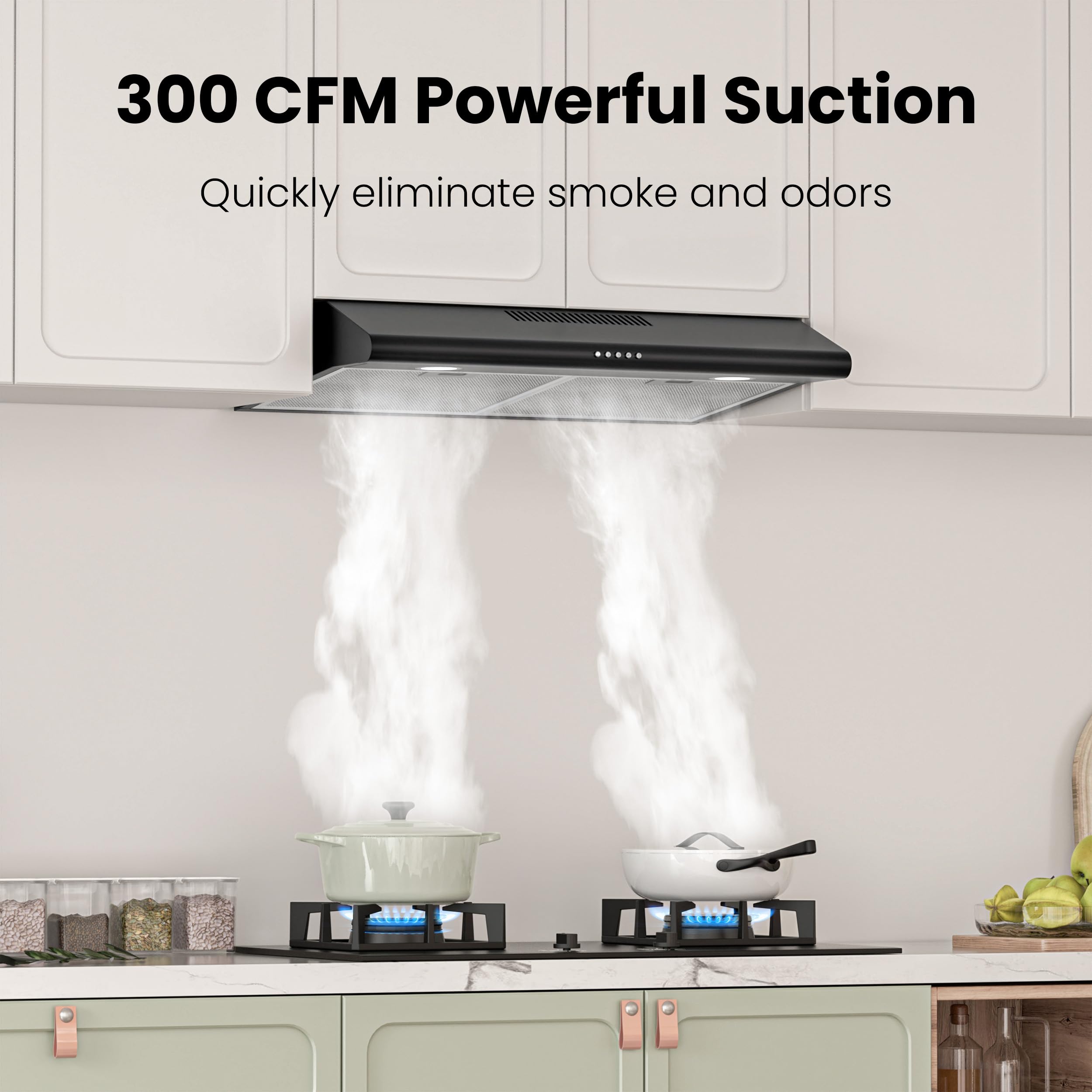 EXCELLENT SOLID: 30 inch under cabinet range hood are brushed for black painted stainless steel adds that sharp, elegant look to your kitchen,2 built-in 1.5-Watt LED lights illuminates entire cooktop and saves energy.2 aluminum mesh filters collect grease and oils pulled from your stovetop and are machine-washable.