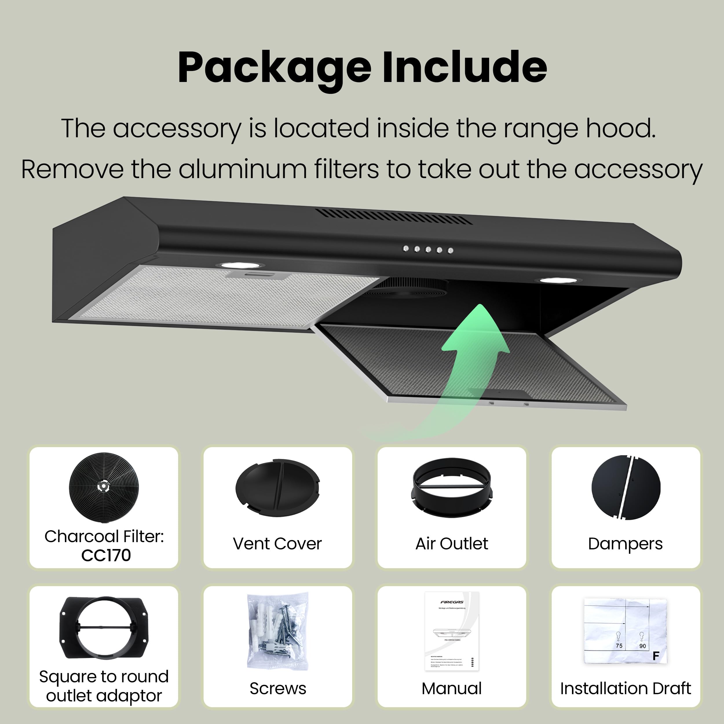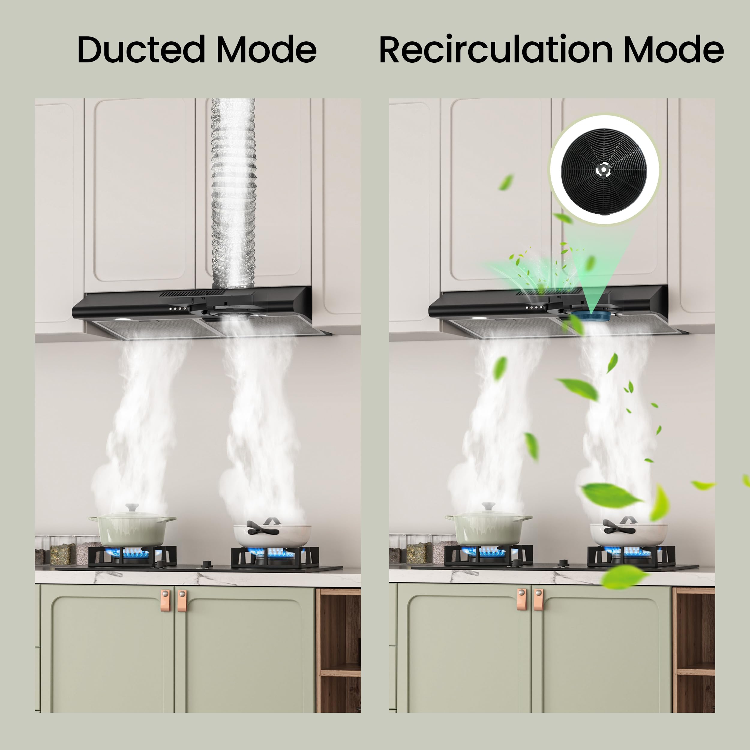 CONVERTIBLE INSTALLATIONS:The kitchen hood designed for outdoor vented (ducted) or indoor vented (non-ducted) installations. Choose from two vent port options and a ventless option for ductless recirculating installation with included carbon filter kit (model: CC170, Asin:B08GZD4JN4) based to your kitchen needs.