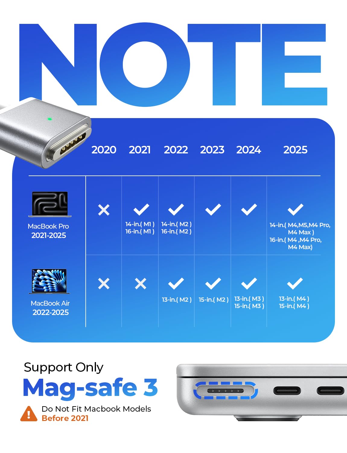 Please Check Your Macbook Model Before Purch: LISEN USB-C to Magnetic 3 Cable Only the following 10 models are supported: MacBook Pro 14-in (M1,2021), MacBook Pro 16-in (M1,2021), MacBook Pro 14-in (M2,2023), MacBook Pro 16-in (M2,2023), MacBook Air 13-in (M2,2022), MacBook Air 15-in (M2,2023), MacBook Air 13-in (M3,2024), MacBook Air 15-in (M3,2024), MacBook Pro 14-in (M4,2024), MacBook Pro 16-in (M4,2024) NOTE: This is USB-C Connector, NOT USB-A Connector
