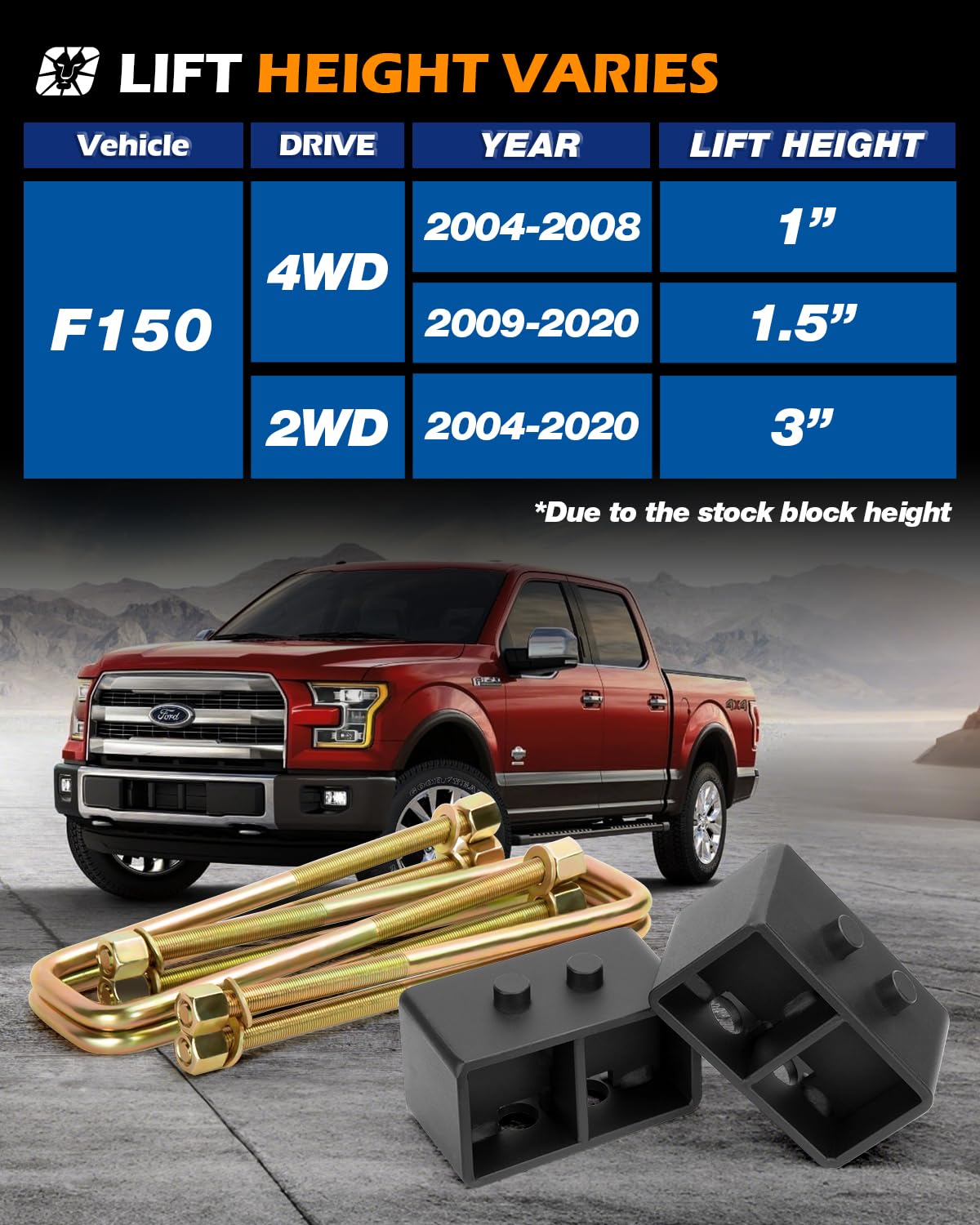 Important Installation Note: 2004-2008 F150 4WD has 2'' stock block, it will provide 1" additional lift; 2009-2020 F150 4WD has 1.5'' stock block, it will provide additional 1.5'' lift; 2004-2020 2WD don't have stock block, it will provide additional 3'' lift