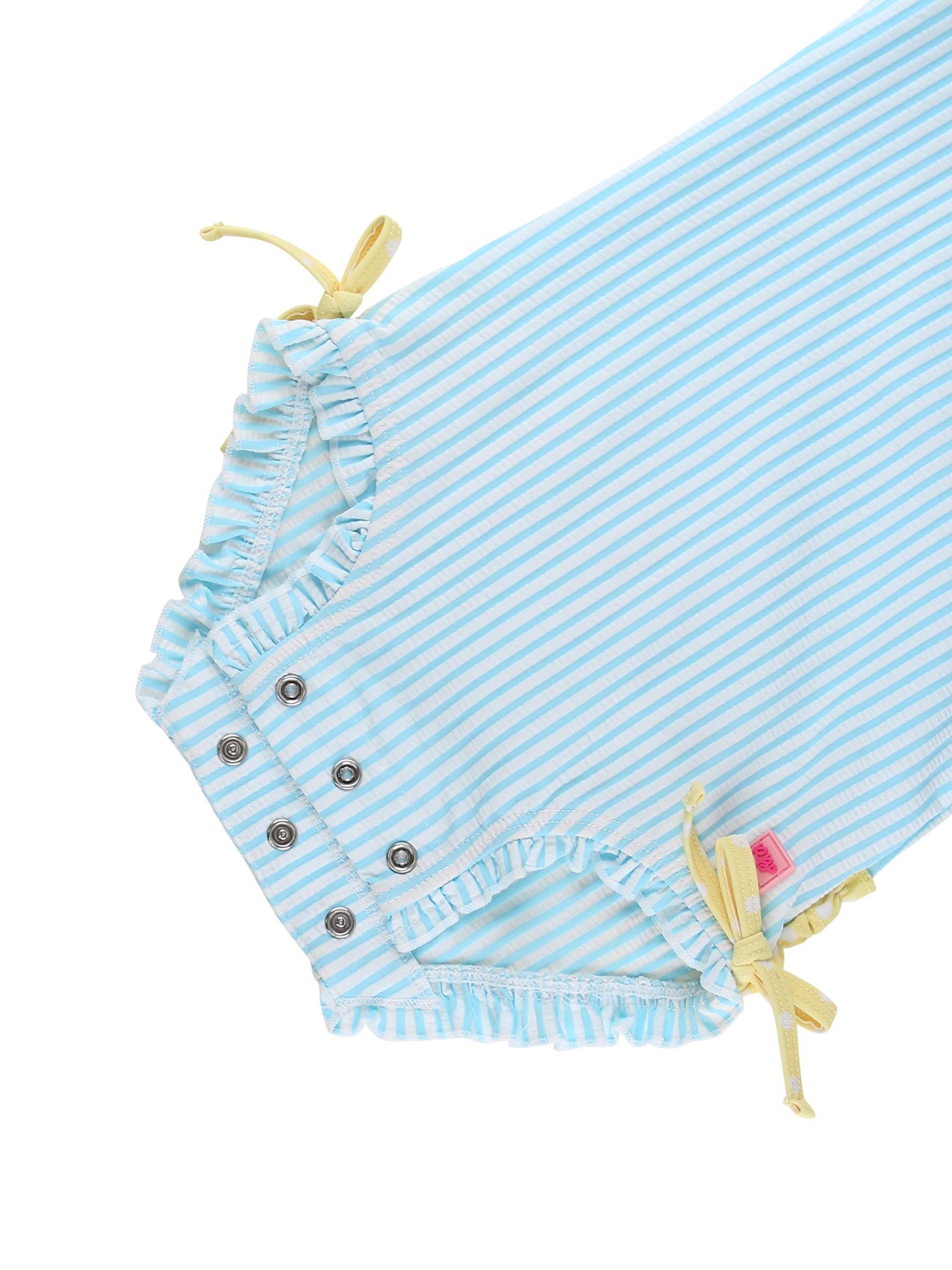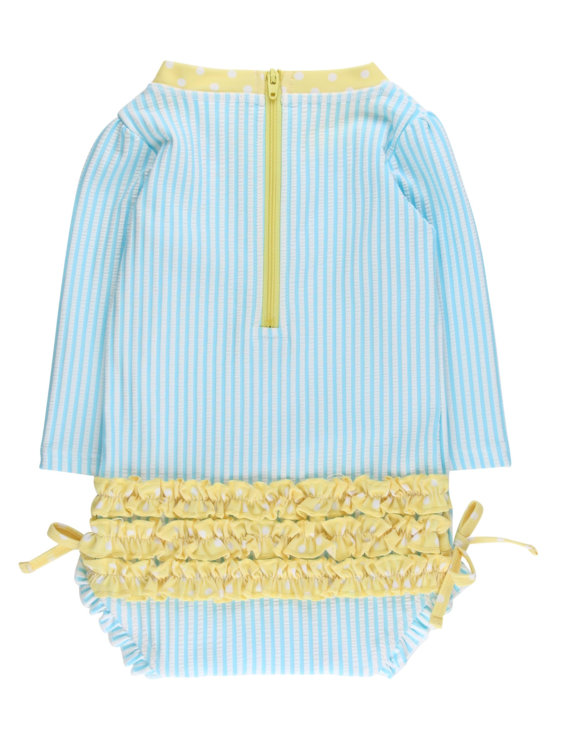 Description Made with a high quality UPF 50+ sun protected fabric, this unlined one piece seersucker bathing suit will keep safe in the sun all day long. Plus, the nickel-free snaps and back zipper make changing a breeze!