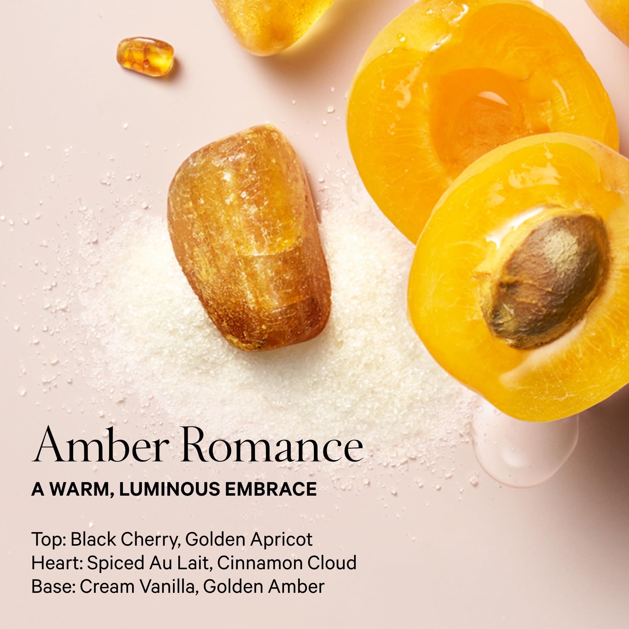 Fragrance top notes are deep amber and sugar kisses. A subtle sweet scent with a feminine musk undertone