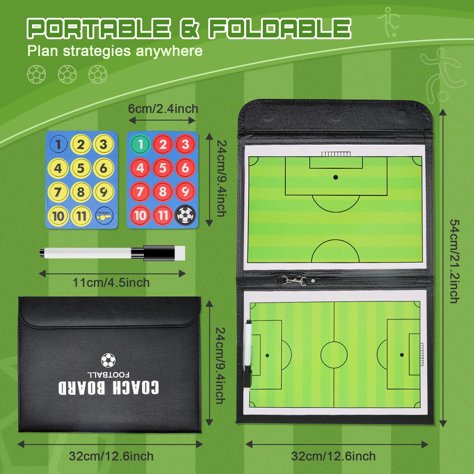 Foldable and Portable Design: With folded dimensions of 32 x 25cm and unfolded dimensions of 54 x 32cm, this lightweight soccer clipboard is ideal for coaches, players and teams at all levels. It is compact and easy to carry wherever you go.