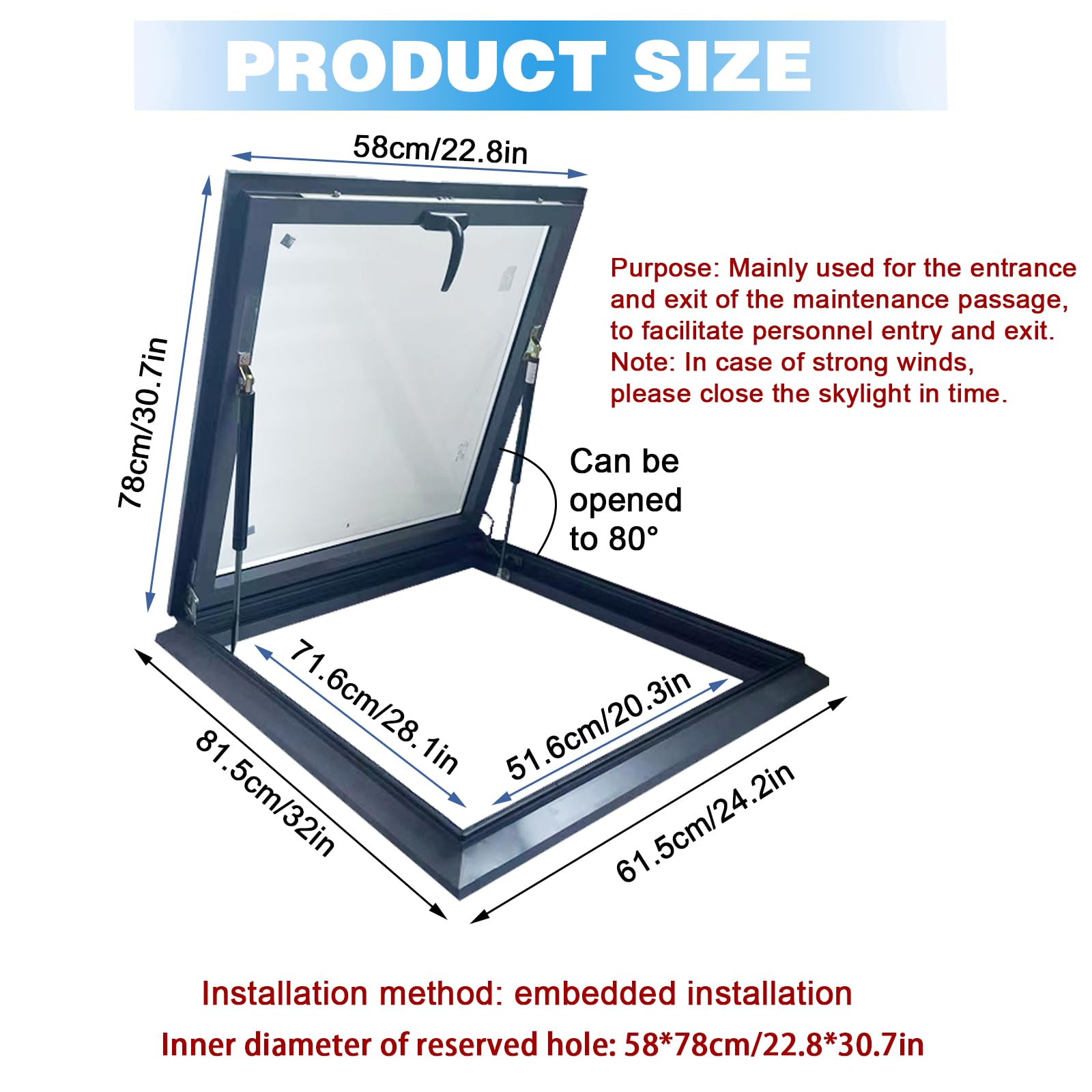 Safe and convenient: This access door provides convenient roof access for various environments. In addition to the sturdy structure, this skylight roof access door can only be opened from the inside, not from the outside. And the lock can easily lock the inside, providing additional security
