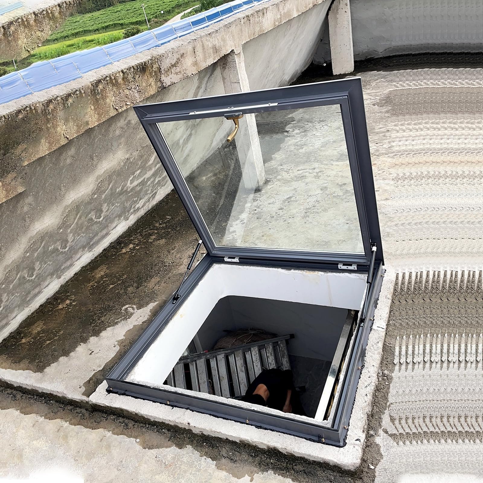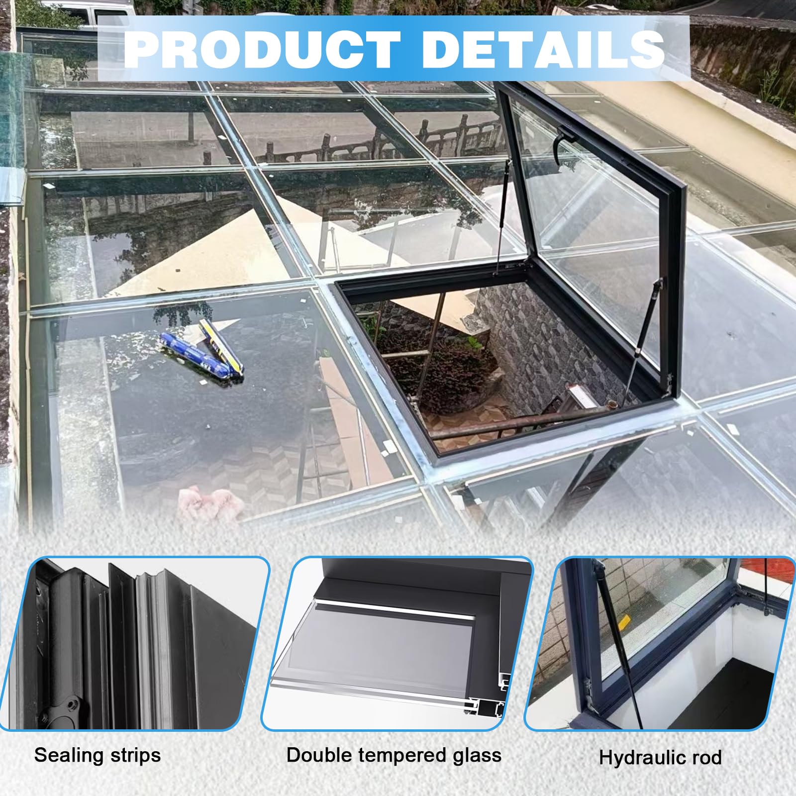 Sturdy and durable: This glass skylight cover is equipped with 2 hydraulic support rods, and the cover can be easily opened or closed. The large opening design is convenient for people to enter and exit. The sealing rubber gasket can effectively prevent rain, dust, debris, etc. from entering the building