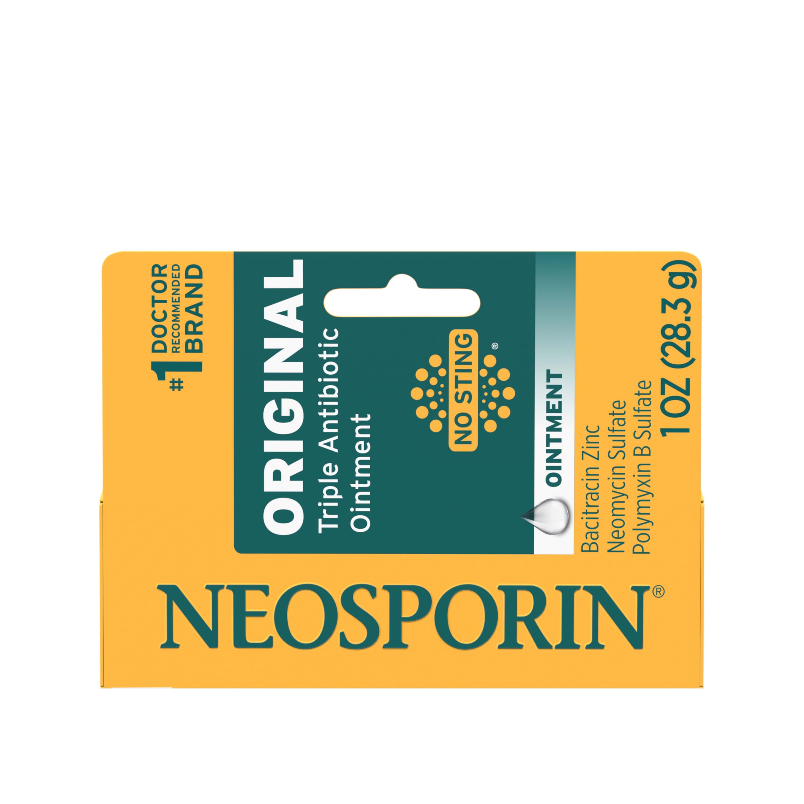 Neosporin Original First Aid Triple Antibiotic Ointment, from the #1 doctor‑recommended brand, delivers 24‑hour infection protection for minor cuts, scrapes, and burns in a compact, portable 1‑oz tube designed for on‑the‑go wound care. This topical antibiotic ointment features a triple antibiotic formula with Neomycin Sulfate, Bacitracin Zinc, and Polymyxin B to help guard against infection while minimizing the appearance of scars. Powered by HeliDerm Technology, it locks in moisture to create a nourishing environment that supports natural skin repair over 24 hours, so skin can heal with fewer visible marks. The smooth, non‑greasy texture spreads easily and stays in place, forming a protective barrier that helps keep out dirt and bacteria. Ideal for home first aid kits, travel pouches, sports bags, office drawers, and camping gear, Neosporin Original ensures trusted, effective care is always within reach for everyday nicks, kitchen mishaps, outdoor scrapes, and other minor burns and abrasions. As an antibacterial ointment often used in place of an antibiotic cream, it streamlines your routine by combining proven infection protection with scar appearance minimizer benefits in one simple step. To use, cleanse the affected area, then apply a small amount one to three times daily and cover with a BAND-AID Brand sterile bandage if desired. Consistent use helps maintain an optimal healing environment and provides reliable protection between bandage changes, giving you confidence that minor wounds are being cared for the right way by a brand that healthcare professionals trust. Keep this 1‑ounce tube on hand wherever life happens to help protect against infection, support healing, and reduce the look of scars after minor cuts, scrapes, and burns.