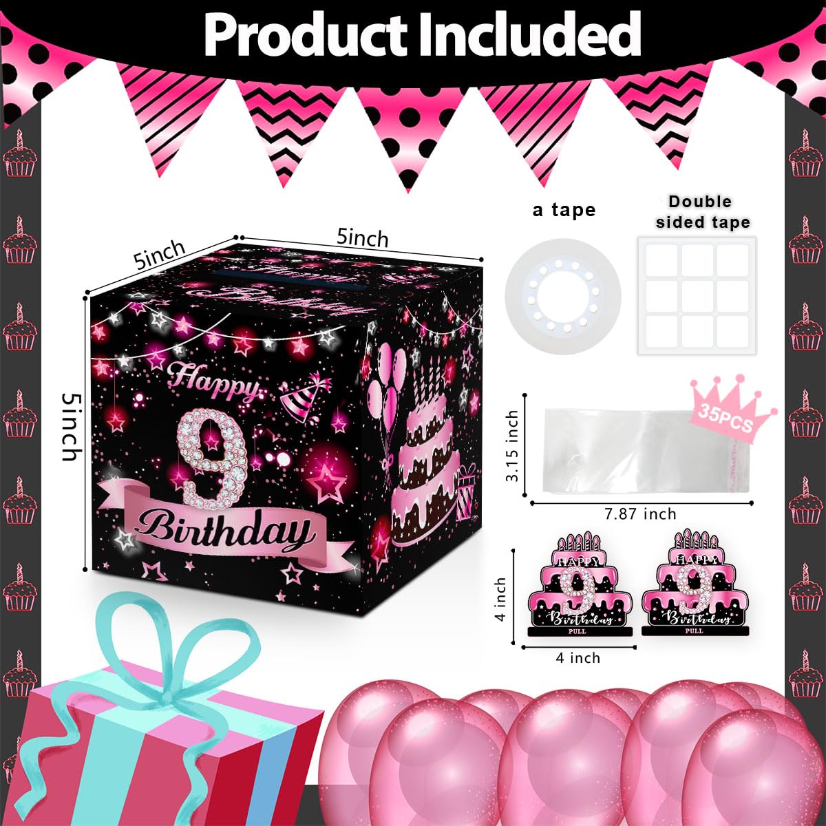 Birthday Money Box for Cash Gift, 9th Surprise Box Explosion Gift for Girls Boys Kids, 9th Birthday Money Gift Ideas, 9 Years Old Birthday Pink Party Decor -Included 35 Bags
