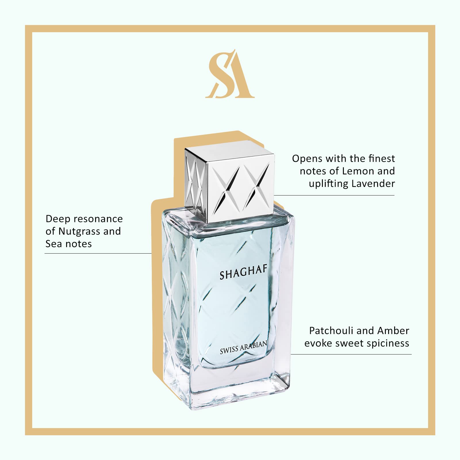 SHAGHAF: YOUR NEW SIGNATURE SCENT; Opens with finest notes of Lemon and uplifting Lavender; The beating heart of the fragrance brings out the deep resonance of Nutgrass and Sea Notes; Patchouli and Amber add depth to the aroma and inspire attention
