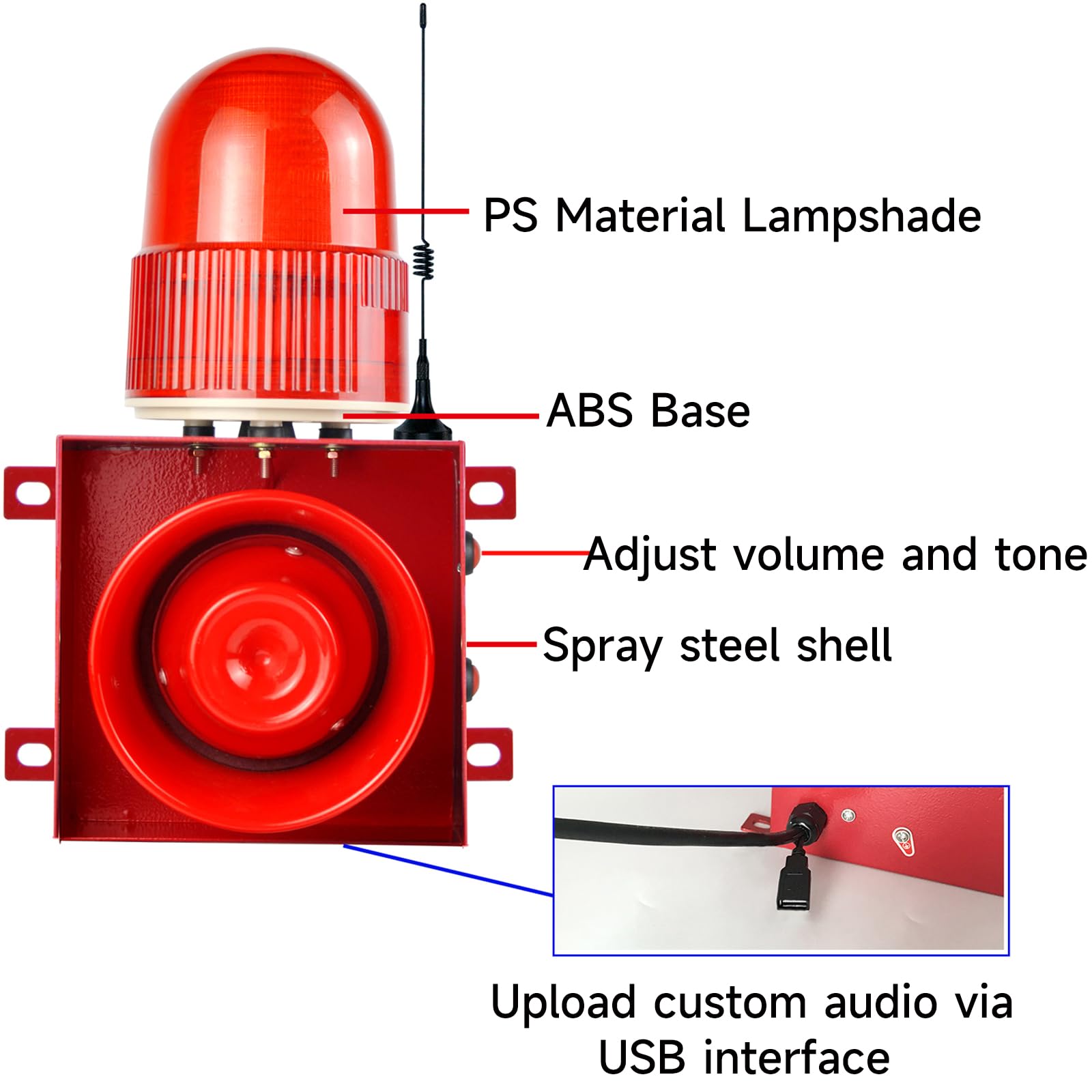 Siren Loud Horn: Equipped with a high-quality speaker, the alarm produces loud and clear sound, ensuring it can be heard over a large area, making it effective for wide coverage. Used in various locations such as warehouse, factory, school, construction site, shopping mall, apartment, yard, port, ship, and crane to alert employees for different emergency conditions (like fire, harmful gases, natural disasters)