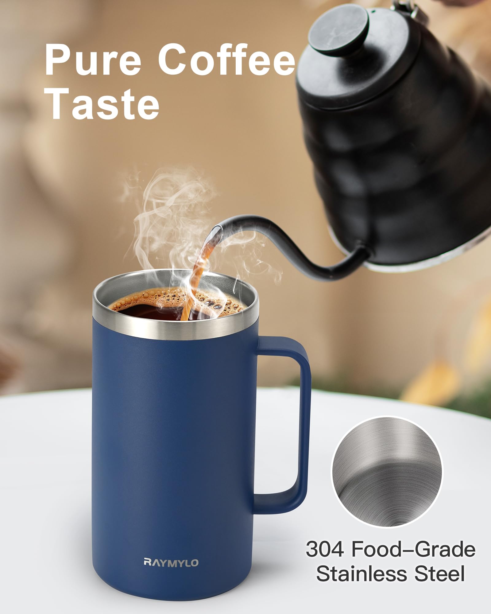 Pure Coffee,Zero Metallic Aftertaste Guaranteed: RAYMYLO coffee mug crafted from 304 food-grade stainless steel, this reusable coffee cup with lid ensures zero metallic aftertaste. Enjoy your coffee, tea, or cold brew with uncompromised flavor ! Perfect for coffee lovers and tea enthusiasts alike.