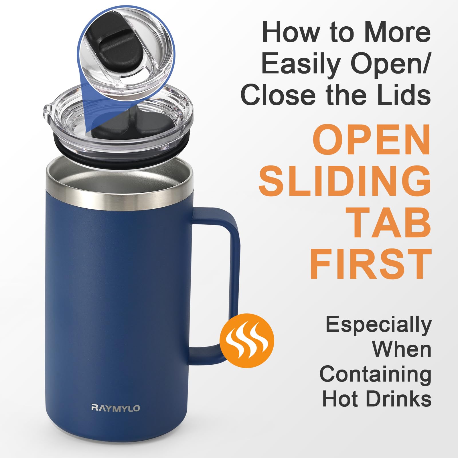 How to More Easily Open/Close the Lids: To ensure leak-proof performance, our lid is tightly sealed which may make it harder to remove or install. lf you face this issue, try two solutions: First, check if the sealing ring is properly positioned and adjust it if needed. Second, slide the tab while removing or installing to balance the internal andexternal air pressure.