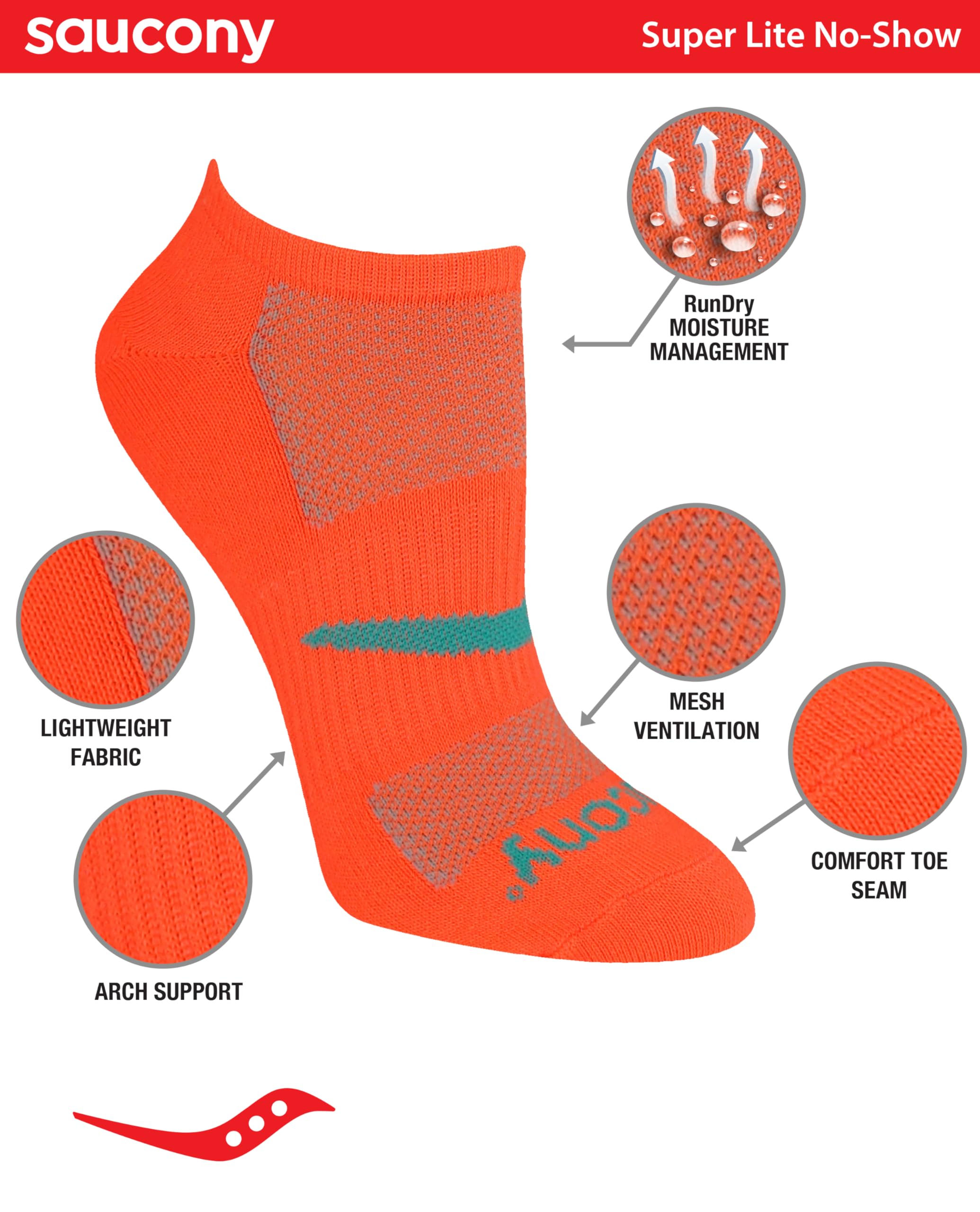 Description Saucony women's performance super lite no show socks is a perfect combination of comfort and support. Great for the toughest training sessions. Features arch support and air mesh venting for lasting comfort. Run for Good - Saucony was founded way back in 1898. Ever since, we have been loyal to the sport, building goodness into every product and inviting millions around the world to run with us. At Saucony, we exist for runners, Runners inspire us, bringing us new idea, force us to be better, they drive our design and engineering. They keep us competitive. They keep us hungry. They keep us honest. This focus and passion fuels us as we strive to create the best running shoes and apparel on the planet. We leave work each day knowing we’ve done everything to make runners live just a little better.